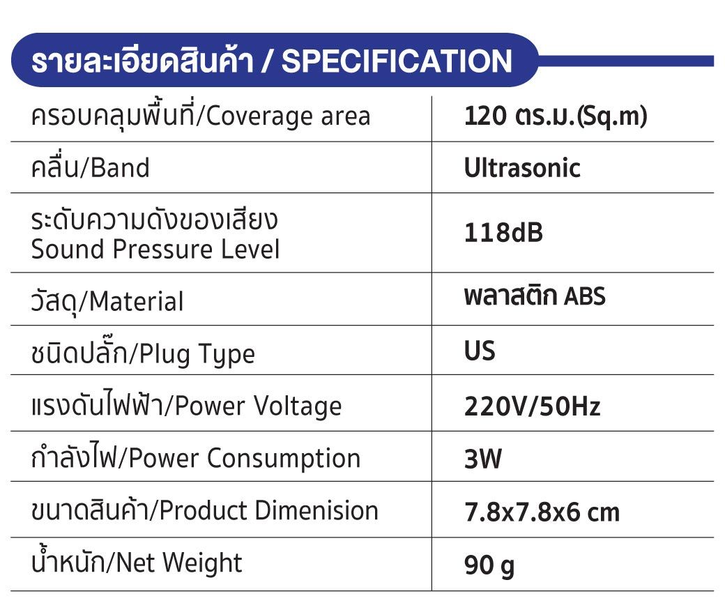 • ใช้เทคโนโลยีคลื่นเสียงความถี่สูงเป็นคลื่น Ultrasonic-wave ไม่เป็นอันตรายต่อมนุษย์ ปลอดภัยต่อเด็กและสัตว์เลี้ยง