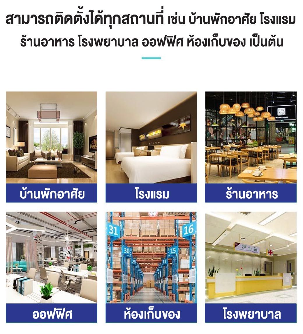 • สามารถใช้งานได้หลายสถานที่ เช่น ห้องนอน ร้านอาหาร โกดังเก็บของ สำนักงาน ร้านค้า โรงแรม โรงพยาบาล และภายในอาคารสถานที่อื่นๆ ได้