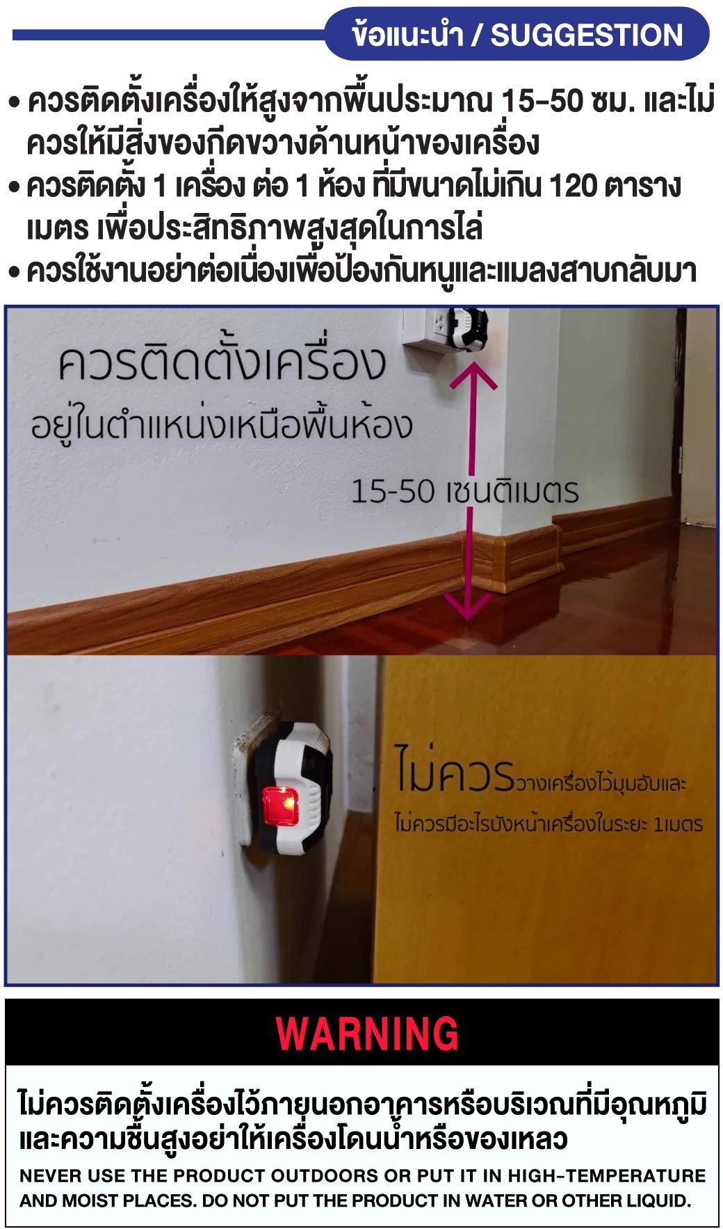 • ควรติดตั้งเครื่องอยู่ในตำแหน่งเหนือพื้นห้องประมาณ 15-50 เซนติเมตร เพื่อให้ได้ประสิทธิภาพในการไล่