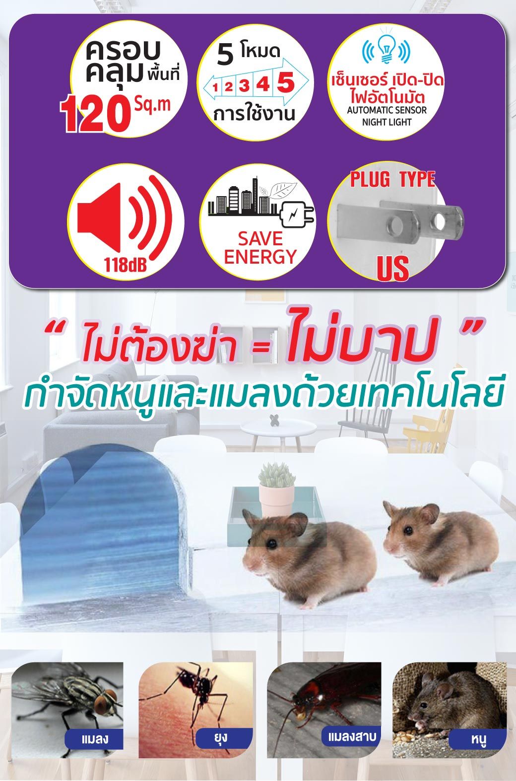 เครื่องไล่หนู และแมลงสาบ ขับไล่ ไล่หนู ไล่แมลงสาบ สัตว์ที่มีฟันแทะที่อยู่ในจำพวกหนู สัตว์ตัวเล็กๆ เช่น แมงมุม มด แมลงสาบ
