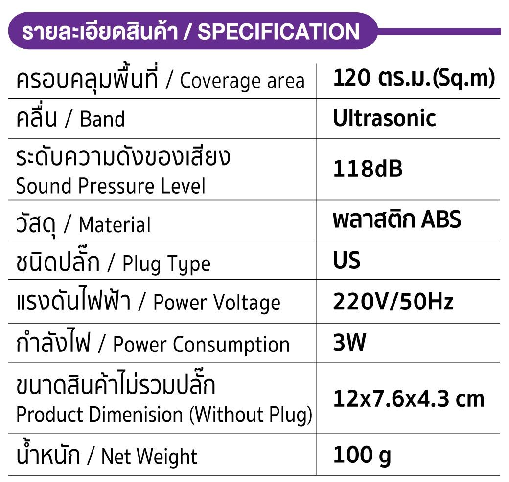 3. ครอบคลุมพื้นที่การใช้งาน 120 ตารางเมตร เพื่อผลลัพธ์ที่ดี ควรติดตั้งอย่างน้อย 1 เครื่อง ต่อ 1ห้อง (แต่หากมีกำแพงกั้น จะลดทอนสัญญาณรบกวนลง) หรือควรติดตั้งมากกว่า 1 เครื่องในพื้นที่ที่มีหนูและแมลงสาบเยอะ