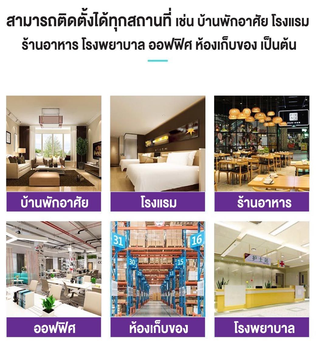 • สามารถใช้งานได้หลายสถานที่ เช่น ห้องนอน ร้านอาหาร โกดังเก็บของ สำนักงาน ร้านค้า โรงแรม โรงพยาบาล และภายในอาคารสถานที่อื่นๆ ได้