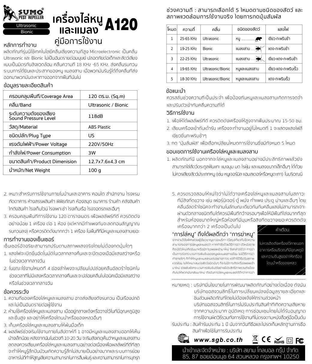 เครื่องไล่หนูและแมลงสาบ รุ่น A120 SUMO