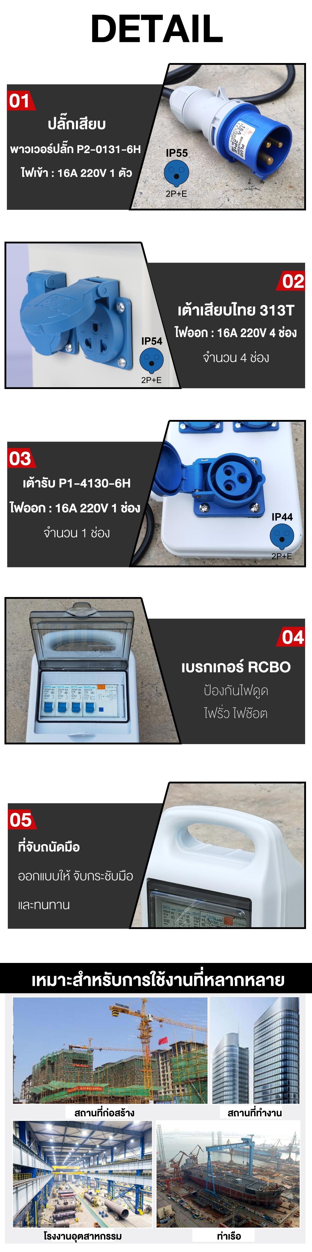 กล่องกระจายไฟ เบรกเกอร์เซฟตี้คัท RCBO 16A ไฟเข้า 16A 220V เต้าไทย 4 ช่อง ไฟออก : 16A 220V เต้ารับพาวเวอร์ปลั๊ก 1 ช่อง ไฟออก : 16A 220V