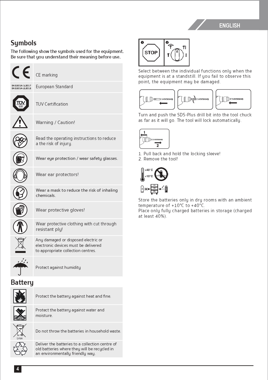 • สว่านโรตารี่ไร้สาย 3 ระบบ เหมาะสำหรับ การเจาะเหล็ก ไม้ และ พลาสติก การเจาะกระแทกพื้นปูนหรือคอนกรีตหรือหิน การสกัด การกระแทกโดยใช้ตัวล็อกแกนหมุนรวมทั้งการสกัดเบา และการกระเทาะ