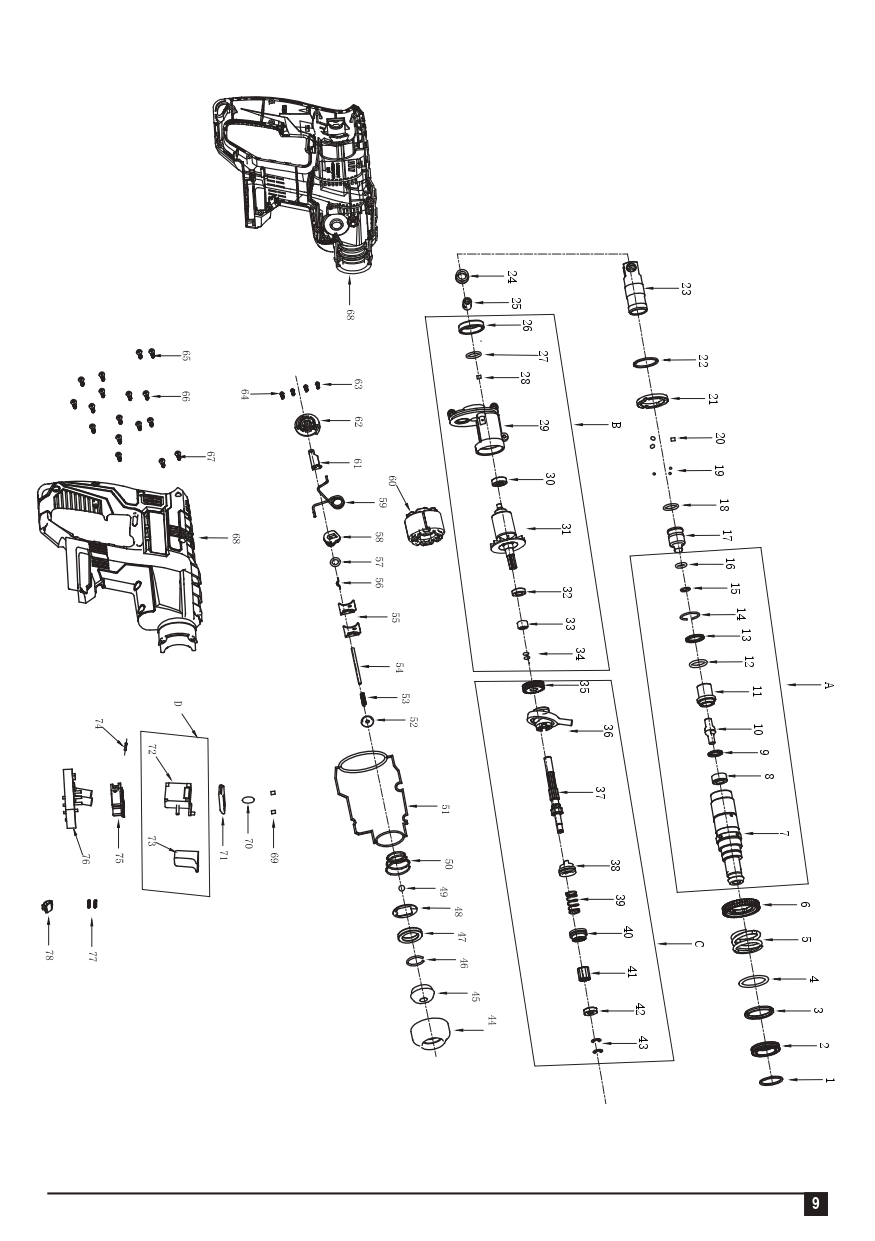 (The machine is a cordless rotary hammer. Made of engineering plastic material that is not flame retardant and has high heat resistance.)