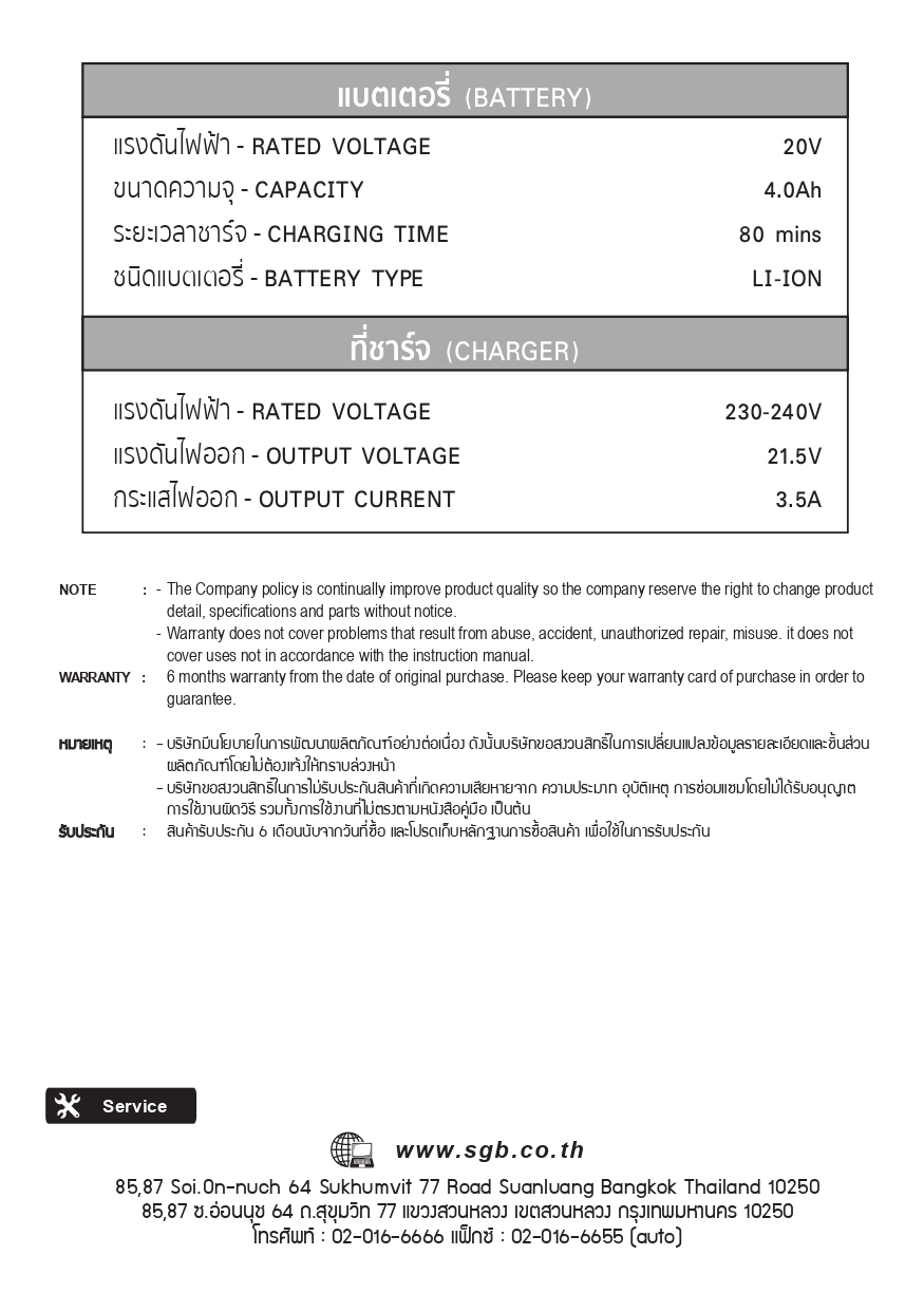 • ระยะการใช้งานต่อเนื่อง (Run time no load) 40 mins.