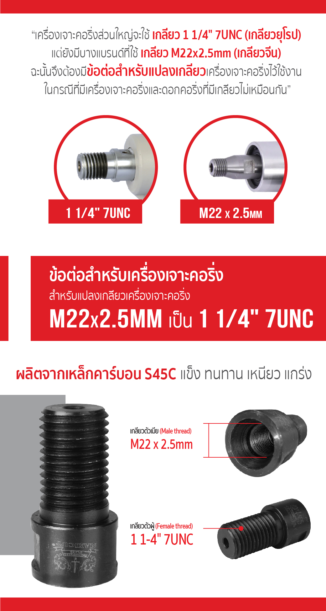 ข้อต่อสำหรับเครื่องเจาะคอริ่ง M22x2.5mm เป็น 1 1/4" 7UNC ข้อต่อคอริ่ง ผลิตจากเหล็กคาร์บอน S45C มีความแข็ง ทนทาน เหนี่ยว แกร่ง