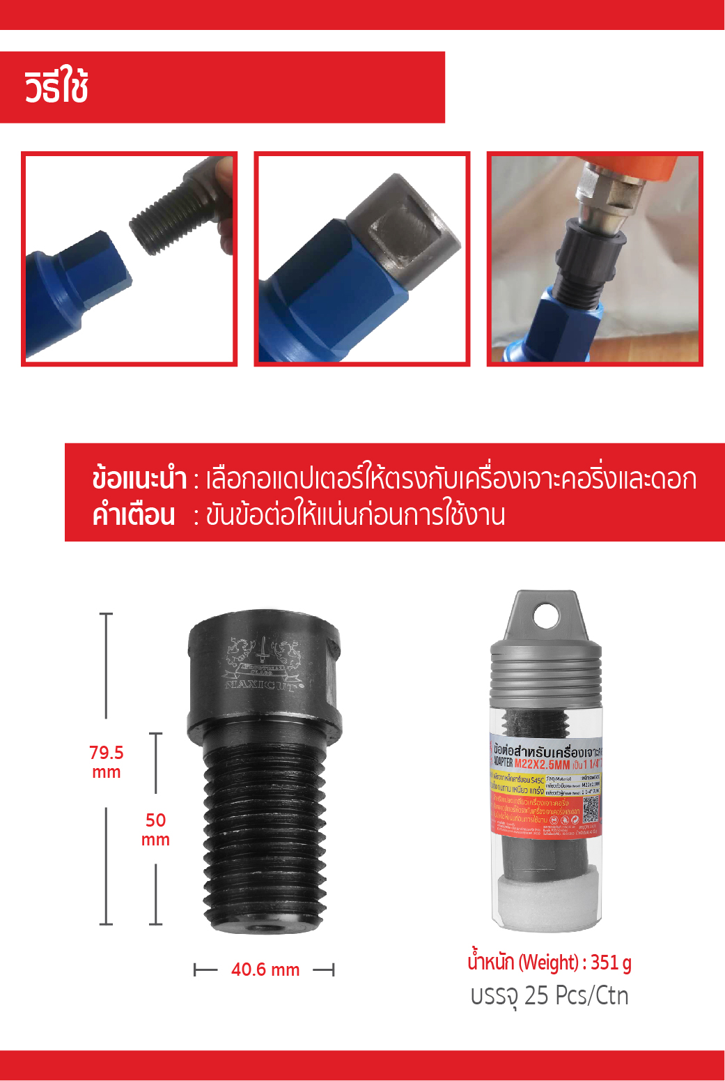 • เลือกอะแดปเตอร์ที่เกลียวตรงกับเครื่องเจาะคอริ่งและดอกเจาะคอริ่ง