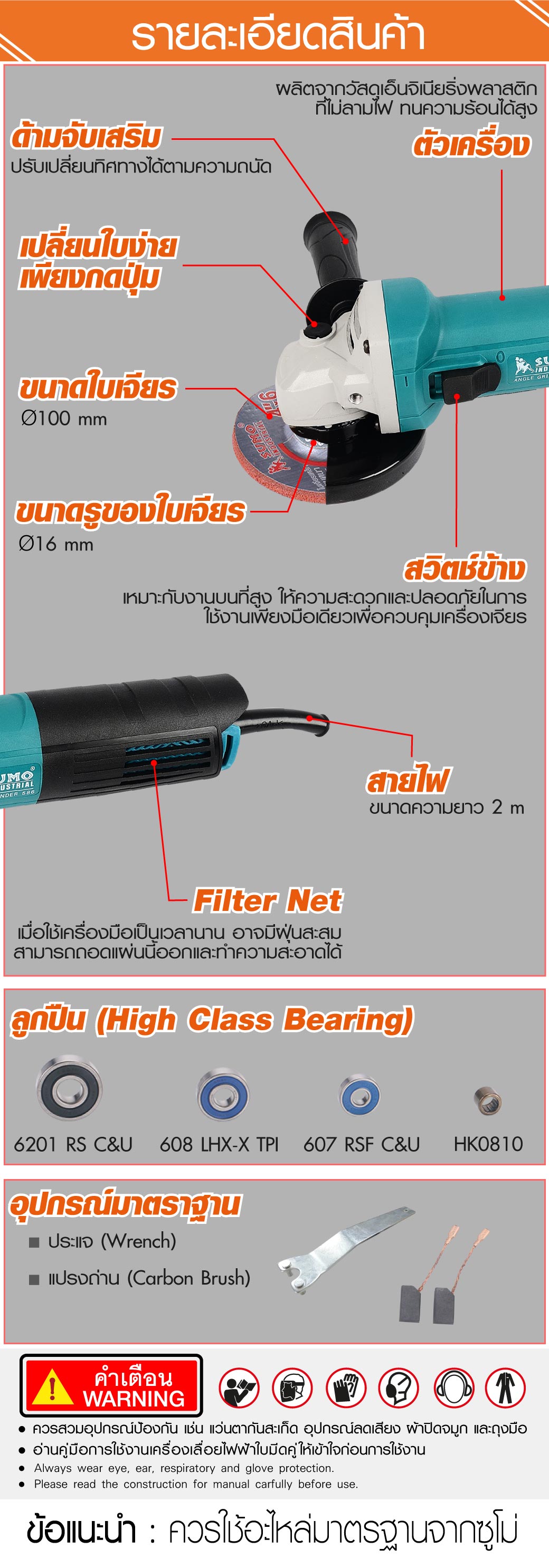 เครื่องเจียร 4 นิ้ว รุ่น 586 สายไฟยาว 2 เมตร มีกำลังวัตต์ 850W และมีความเร็วรอบ 11000 รอบต่อนาที