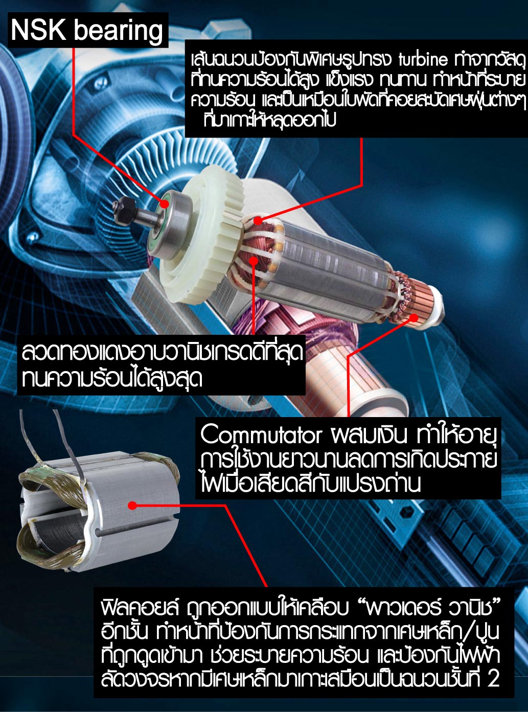 (Ventilation channel is designd from standard size at 3x3mm for protecting something that can pass through the inside. The shape of channel is designed from Aerodynamics standard that make the air can pass through in high volume, the heat flow is well and the armature has the elongation of life as well.)