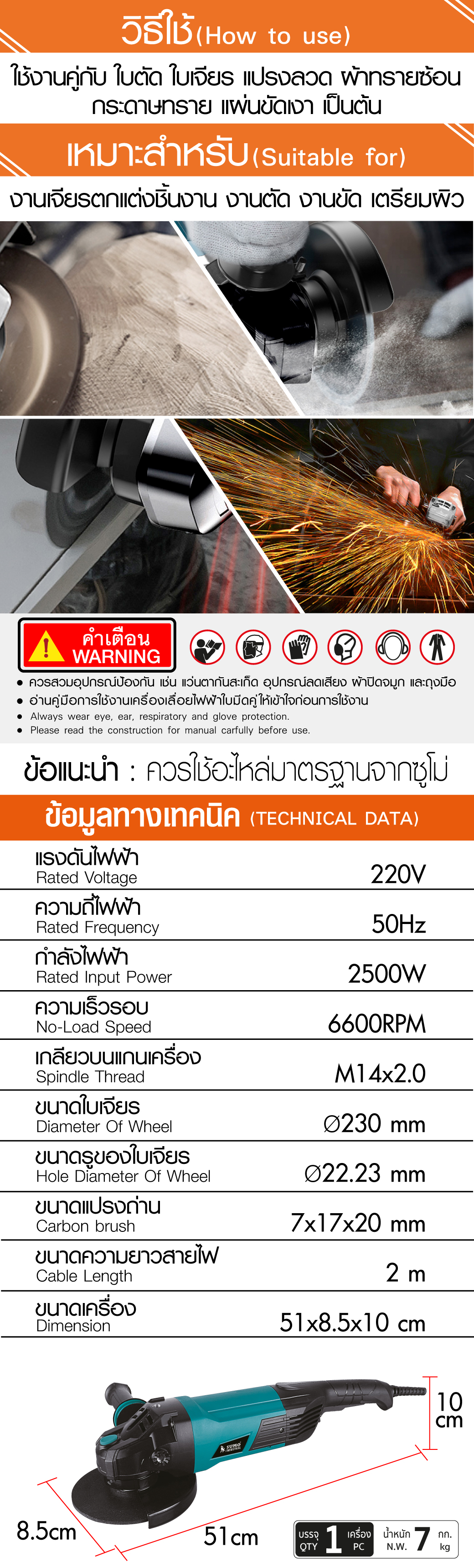 • เครื่องเจียร 9 นิ้ว ใช้งานคู่กับใบตัด ใบเจียร แปรงลวด ผ้าทรายซ้อน กระดาษทราย แผ่นขัดเงา เป็นต้น