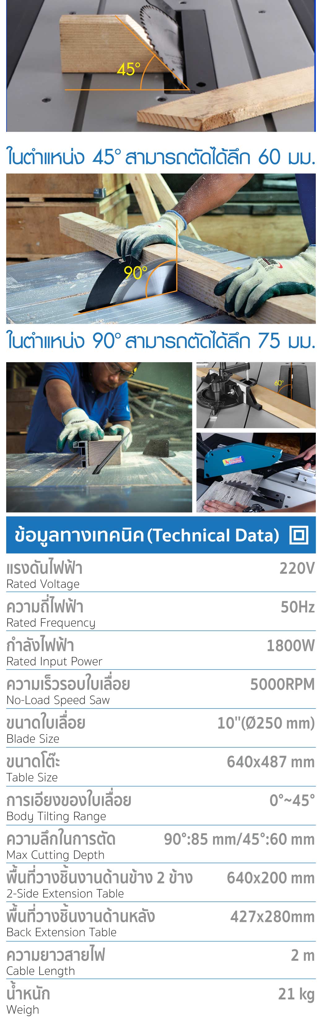 • ในตำแหน่ง 45 º สามารถตัดได้ลึก 60 มม.