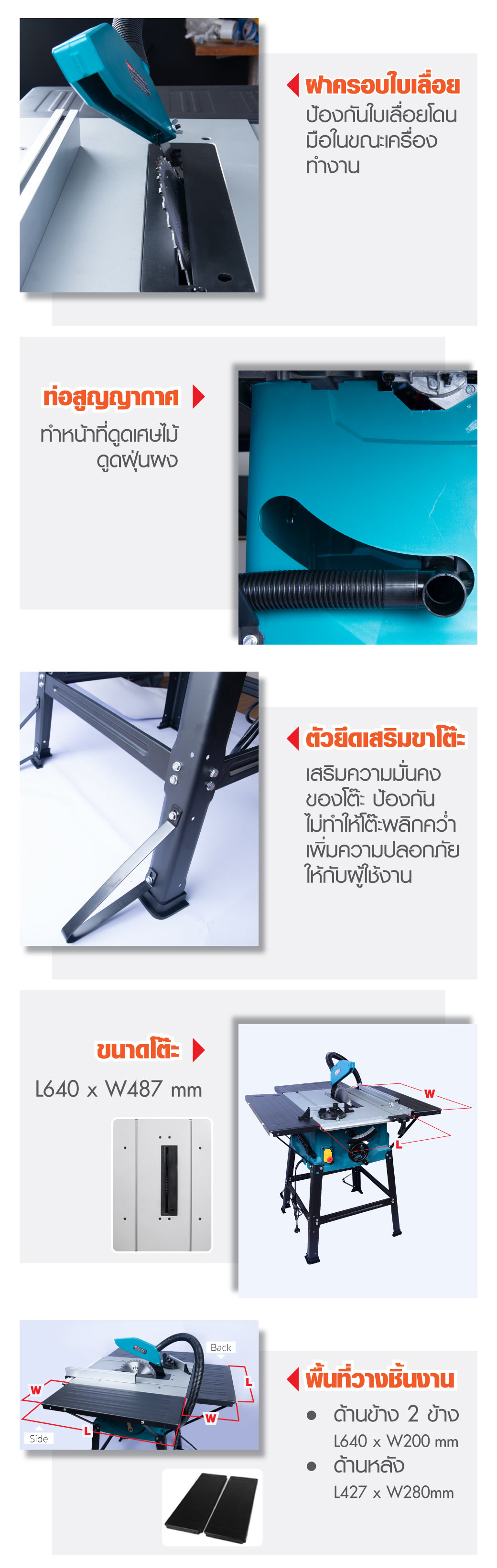 • ขนาดโต๊ะเลื่อยวงเดือน 640x487mm / พื้นที่วางชิ้นงานด้านข้าง 2 ข้าง 640x200mm