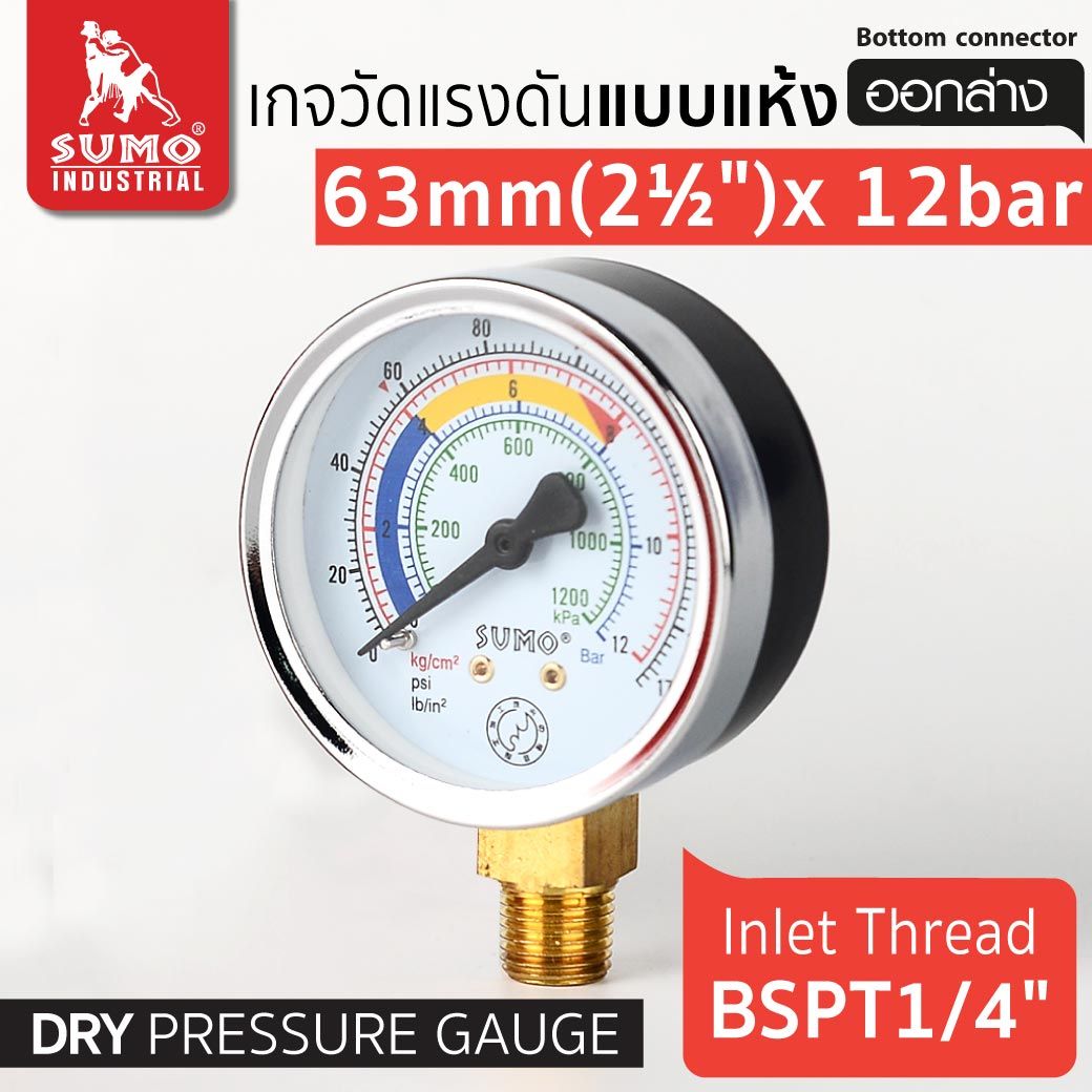 เกจวัดแรงดัน แบบแห้ง 63mm.x12barx1/4" ออกล่าง หน้าปัดขนาด 63 mm. เกลียว BSPT 1/4" (2หุน) สำหรับงานวัดแรงดันทั่วไป วัดค่าแรงดันน้ำ แก๊ส ลม หรือ น้ำมัน