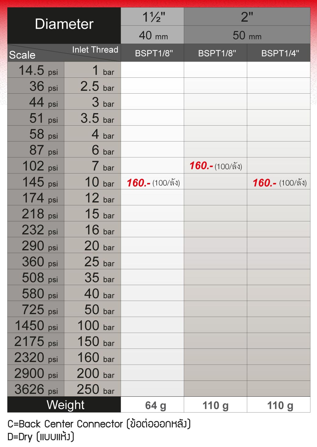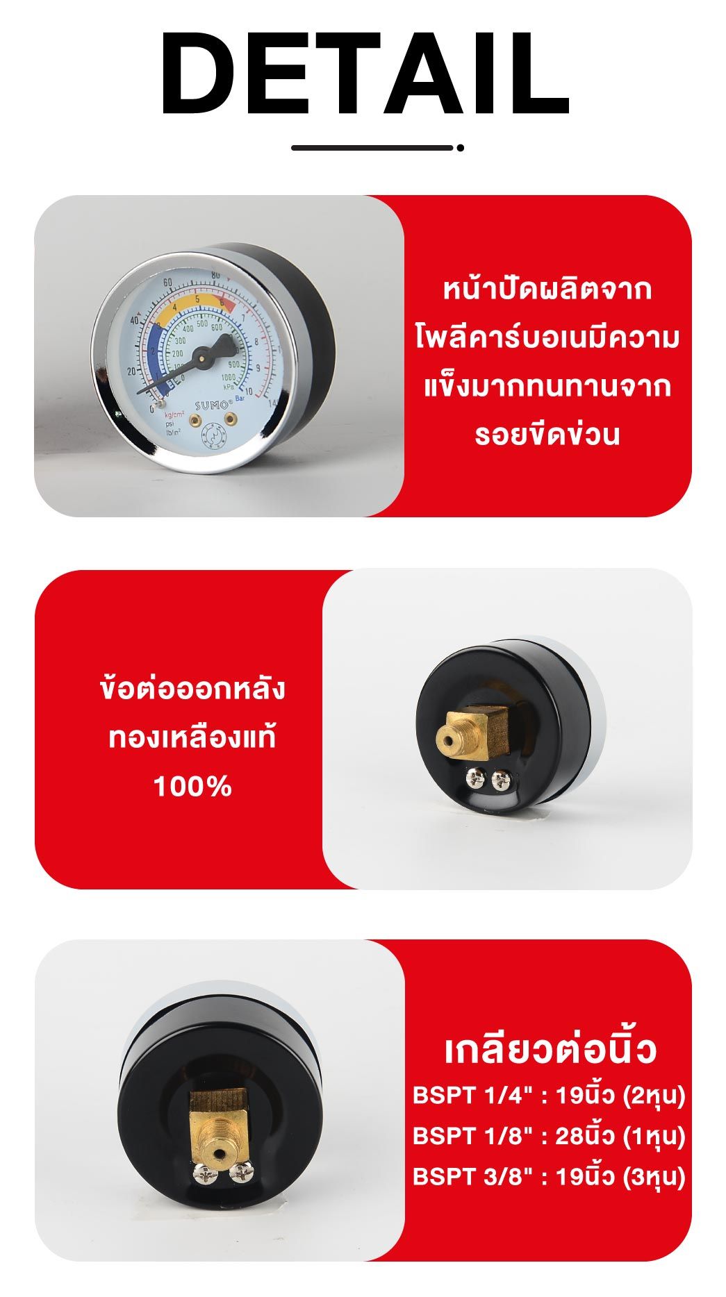 • หน้าปัดขนาด 40 mm. ใช้วัดค่าแรงดันน้ำ แก๊ส ลม หรือ น้ำมัน