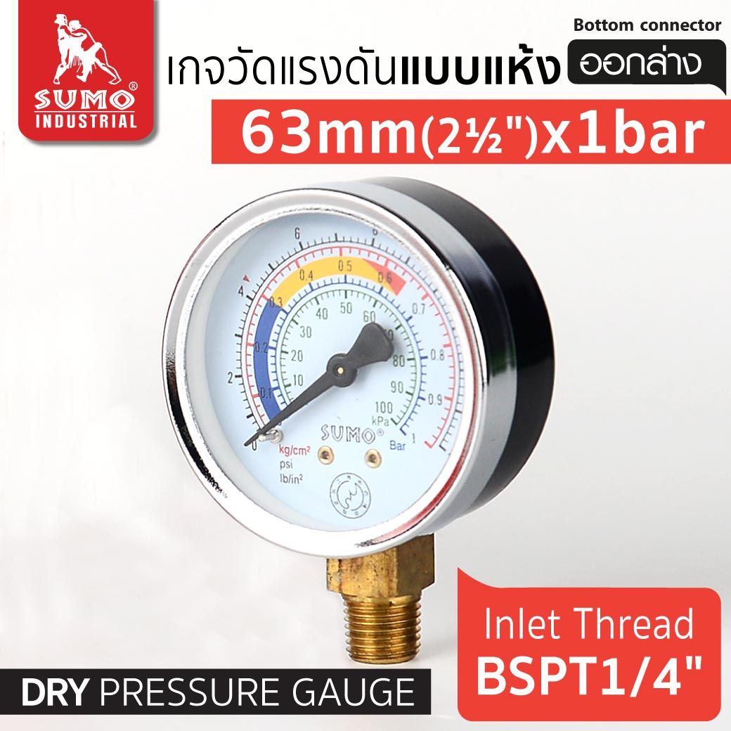 เกจวัดแรงดัน แบบแห้ง 63mm.x1barx1/4" ออกล่าง หน้าปัดขนาด 63 mm. เกลียว BSPT 1/4" (2หุน) สำหรับงานวัดแรงดันทั่วไป วัดค่าแรงดันน้ำ แก๊ส ลม หรือ น้ำมัน