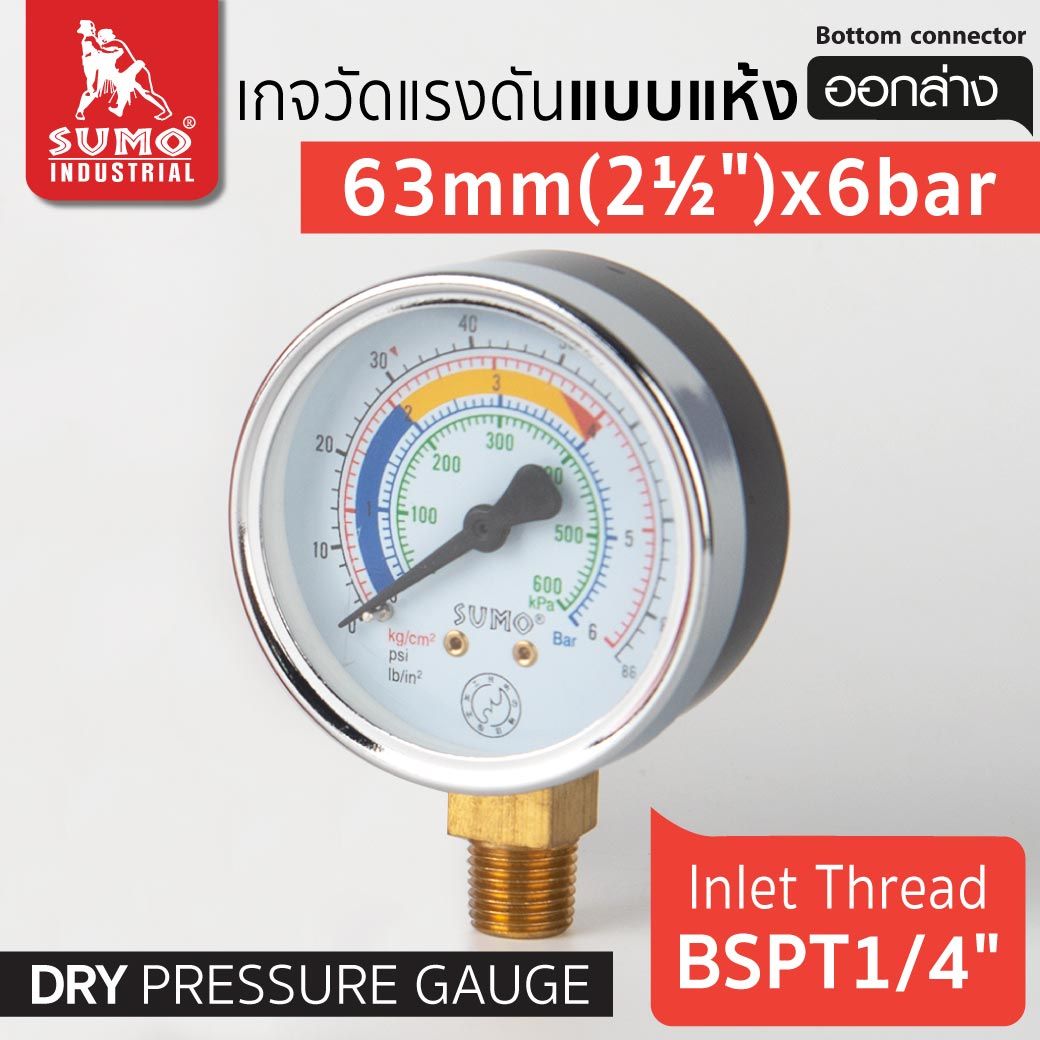 เกจวัดแรงดัน แบบแห้ง 63mm.x6barx1/4" ออกล่าง หน้าปัดขนาด 63 mm. ใช้วัดค่าแรงดันน้ำ แก๊ส ลม หรือ น้ำมัน