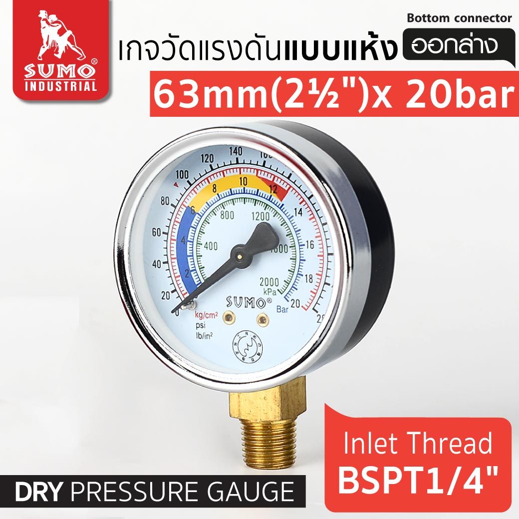 เกจวัดแรงดัน แบบแห้ง 63mm.x20barx1/4" ออกล่าง หน้าปัดขนาด 63 mm. เกลียว BSPT 1/4" (2หุน) สำหรับงานวัดแรงดันทั่วไป วัดค่าแรงดันน้ำ แก๊ส ลม หรือ น้ำมัน