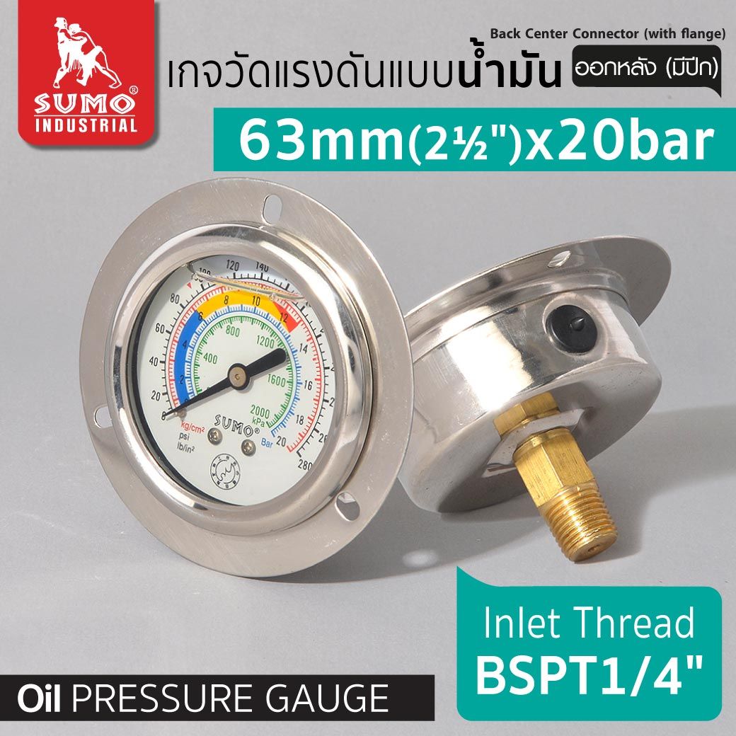 เกจวัดแรงดัน แบบน้ำมัน 63mm.x20barx1/4" ออกหลัง (มีปีก)