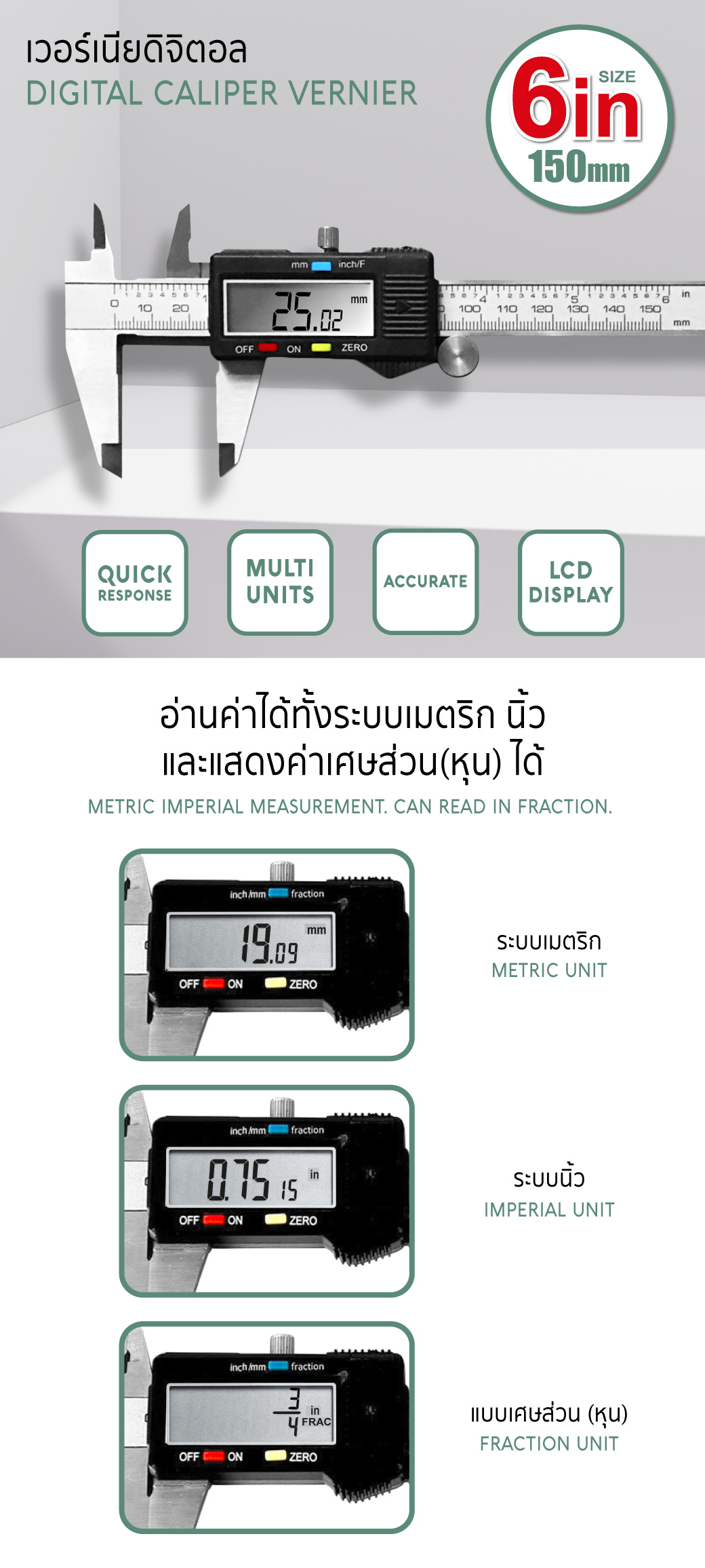 • เปลี่ยนหน่วยการวัดได้ทันที นิ้ว, มิลลิเมตร, เศษส่วน