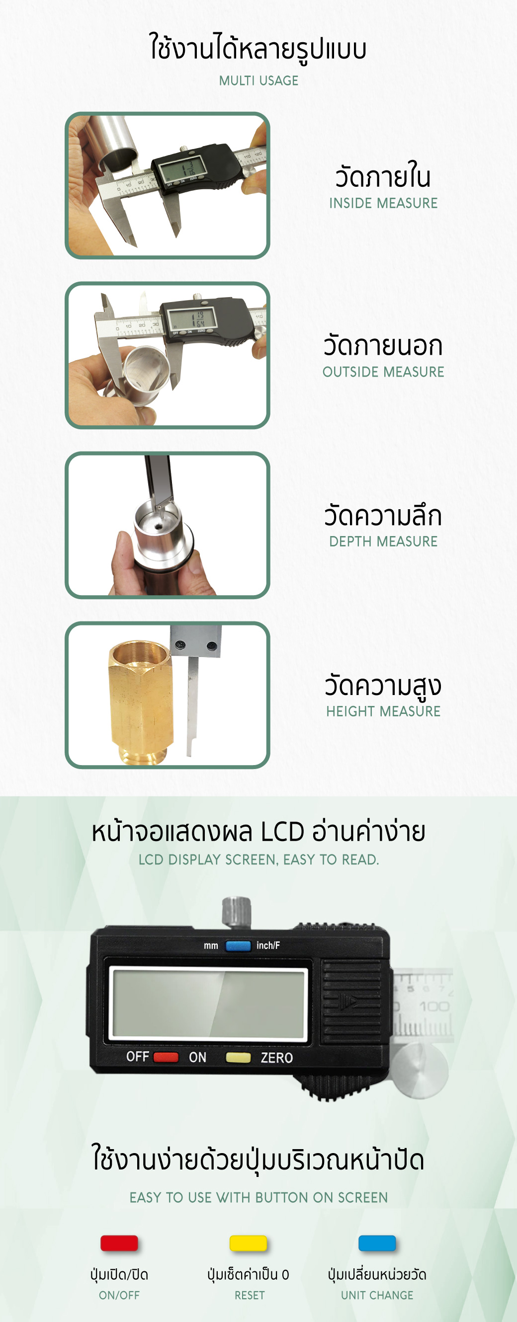 • วัดภายใน/ วัดภายนอก / และวัดความลึก