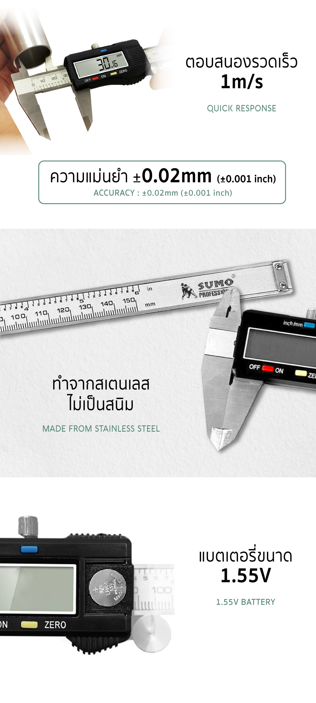 • ความละเอียดในการวัด 0.02มม./0.0010 นิ้ว ให้ความเที่ยงตรงและแม่นยำ