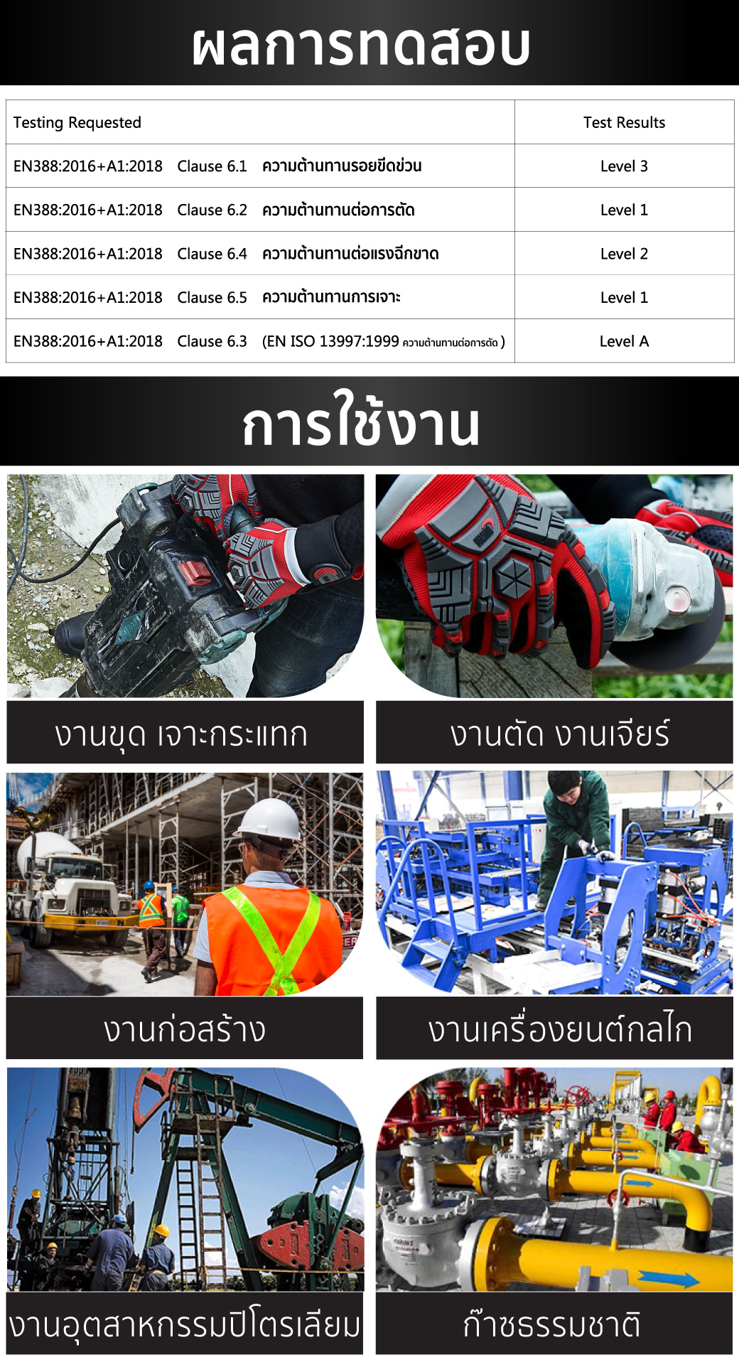 • ป้องกันการตัด การเจาะ กันกระแทก กันน้ำมัน และกันการลื่นไถล