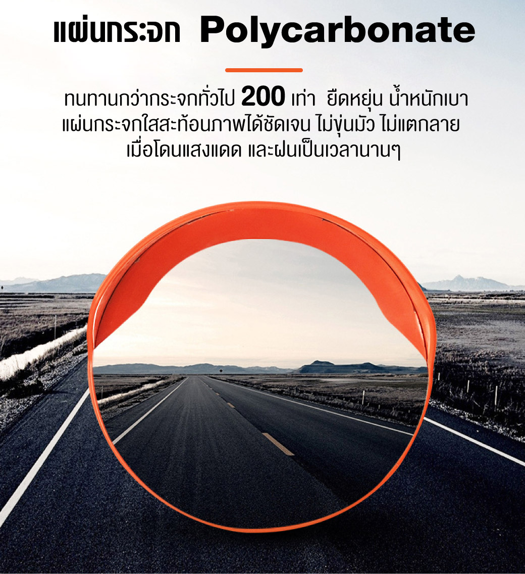 • ตัวแผ่น กระจกโค้งจราจร ทำจากโพลีคาร์บอเนต ขนาด 40 นิ้ว หรือเรียกสั้น ๆ ว่า PC  (Polycarbonate) มีความแข็งแรง ทนทานต่อการแตกหัก มีน้ำหนักเบา แผ่นกระจกใสไม่ขุ่นมัวสะท้อนภาพได้ชัดเจน ไม่แตกลายเมื่อโดนแสงแดดและฝนเป็นเวลานาน  สามารถทำความสะอาดได้ง่าย  เสริมความแข็งแกร่งของกระจกด้วยขอบอลูมิเนียม ทำให้แข็งแรงยิ่งขึ้น