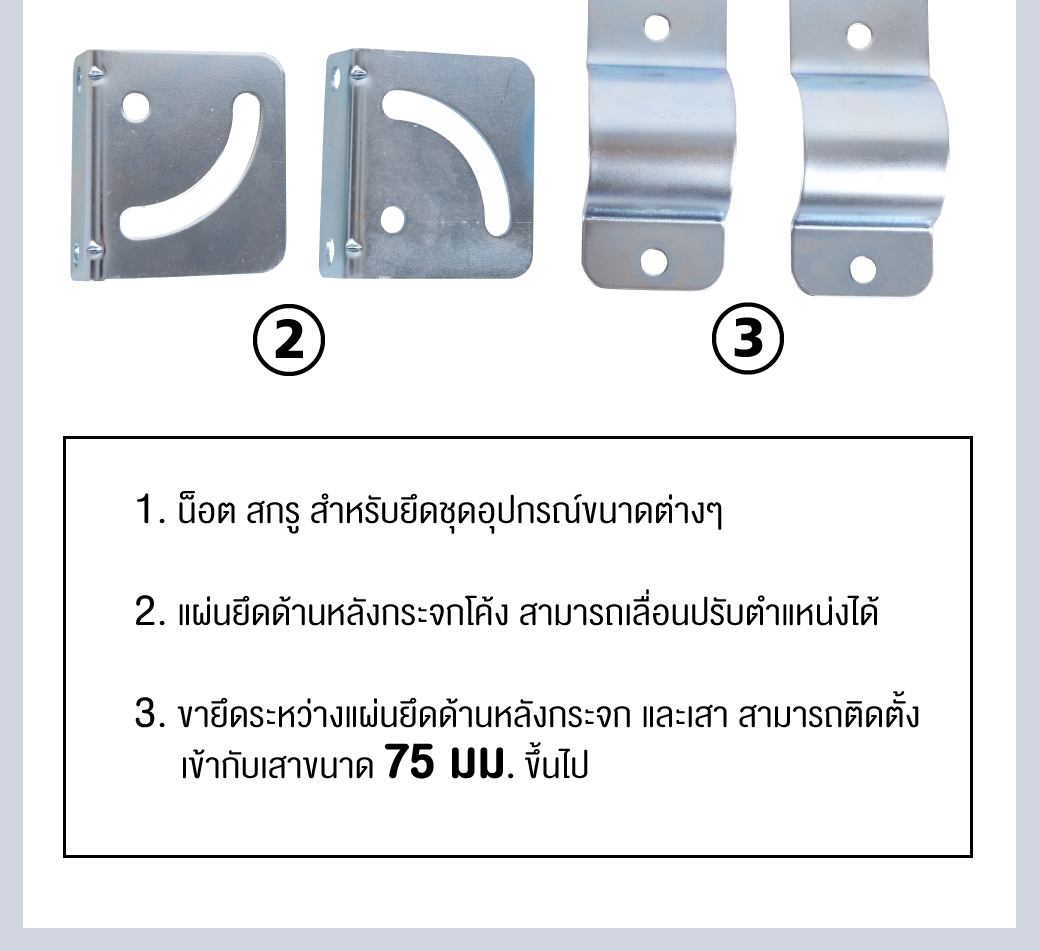 • มีกระบังหน้า พร้อมอุปกรณ์ติดตั้ง ชุดขายึดเหล็ก ยึดผนัง