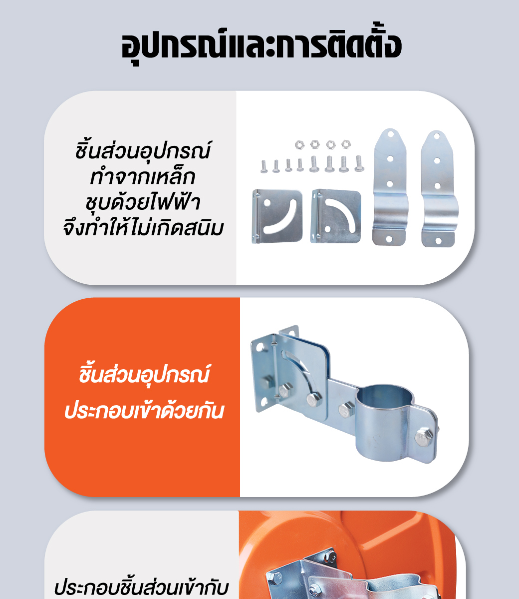 • มีขาจับสำหรับติดตั้ง ทำจากเหล็กชุบด้วยไฟฟ้าจึงทำให้ไม่เกิดสนิม มีความแข็งแรงสูงและยึดจับได้ดี ทนต่อทุกสภาพแวดล้อม ติดตั้งง่าย