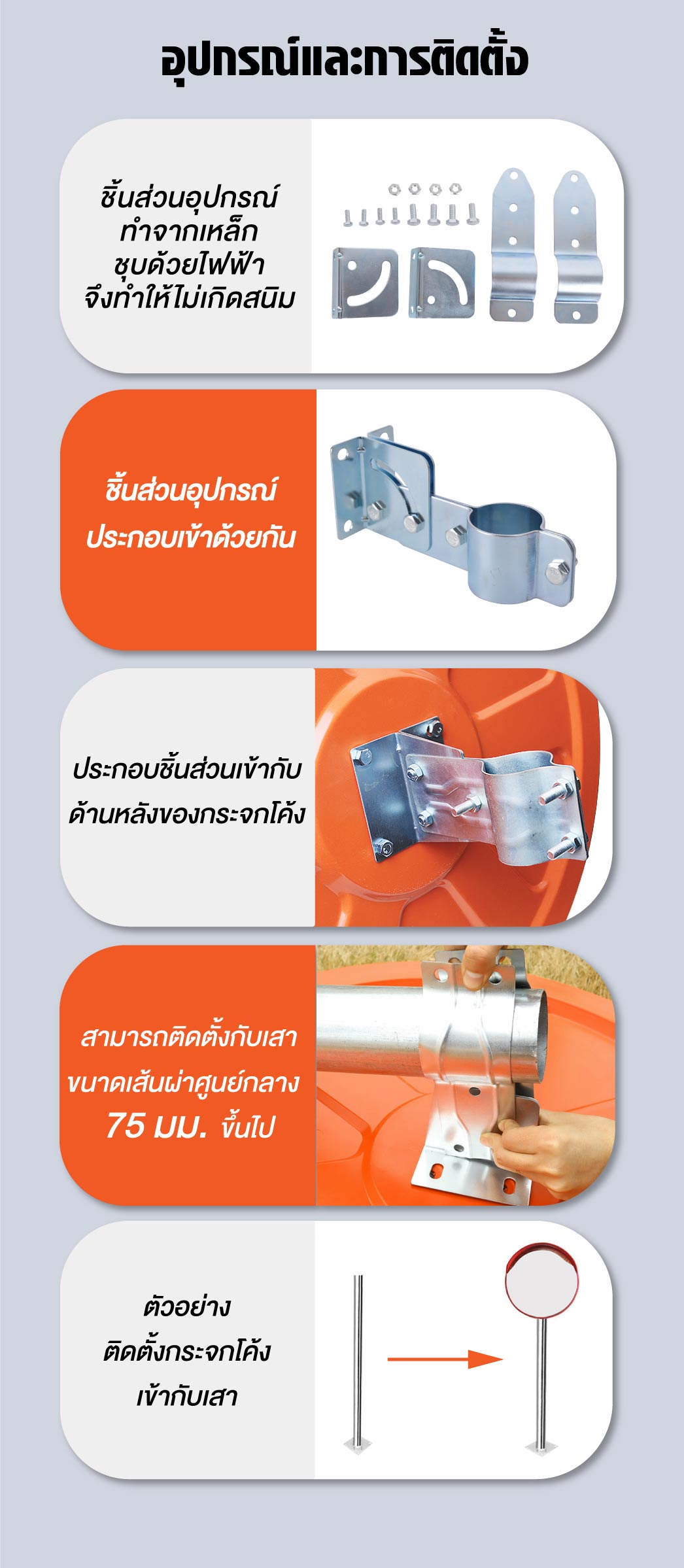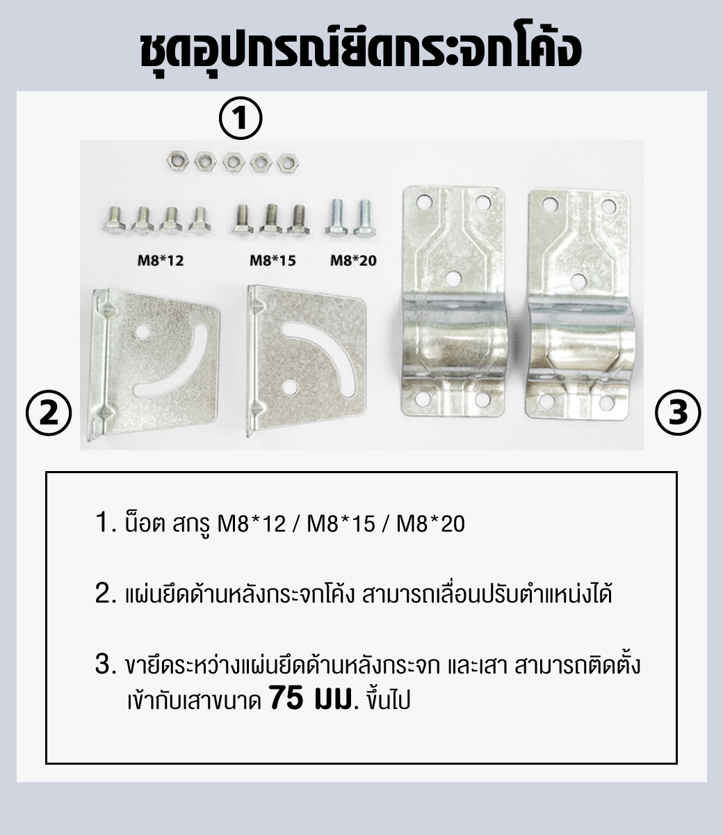 • กระจกจราจร มีกระบังหน้า พร้อมอุปกรณ์ติดตั้ง ชุดขายึดเหล็ก ยึดผนัง
