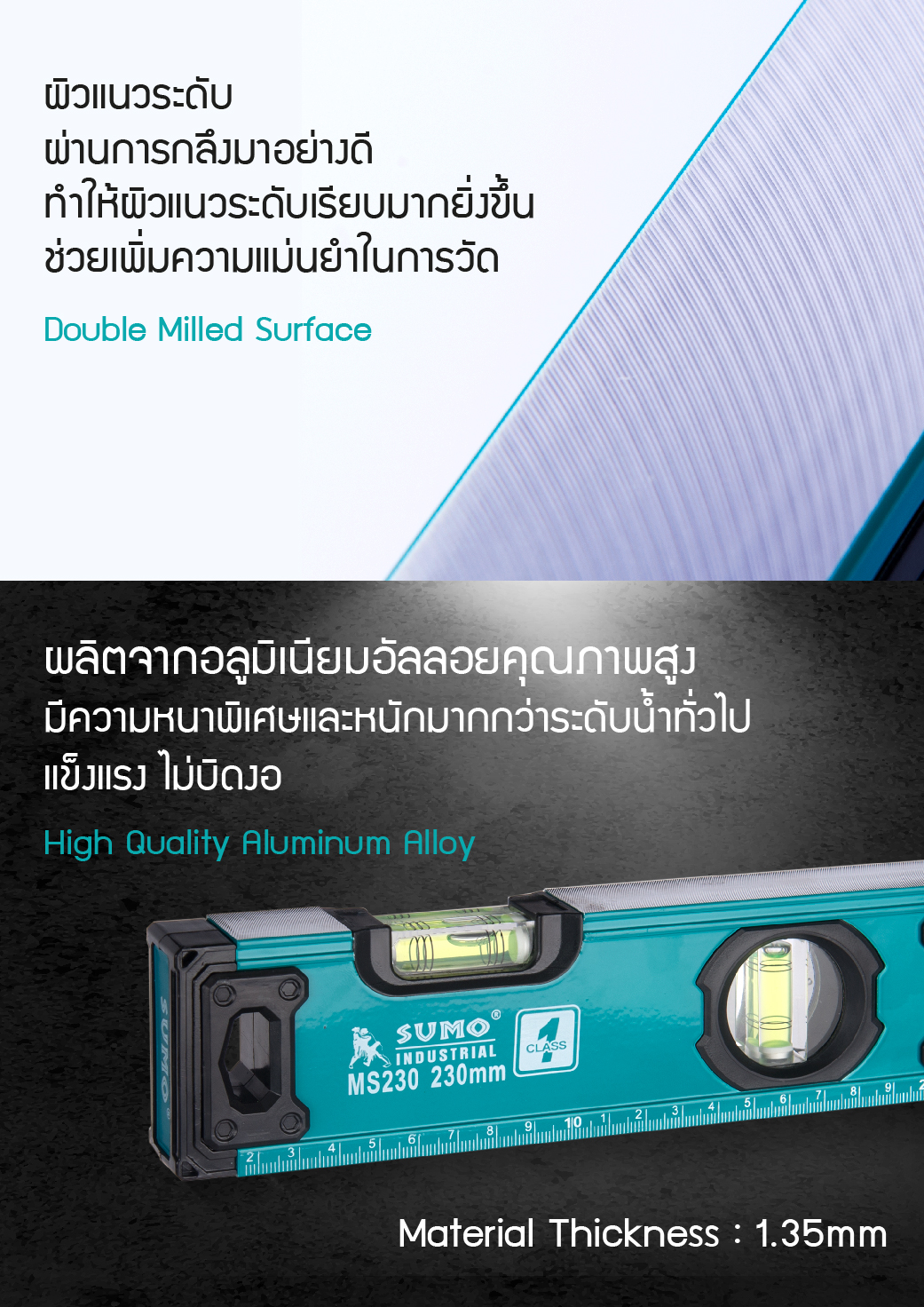 • หลอดลูกน้ำคุณภาพดีสีเขียวใส ไม่ขุ่นหมอง ทำให้สามารถวัดระดับได้อย่างถูกต้อง แม่นยำ