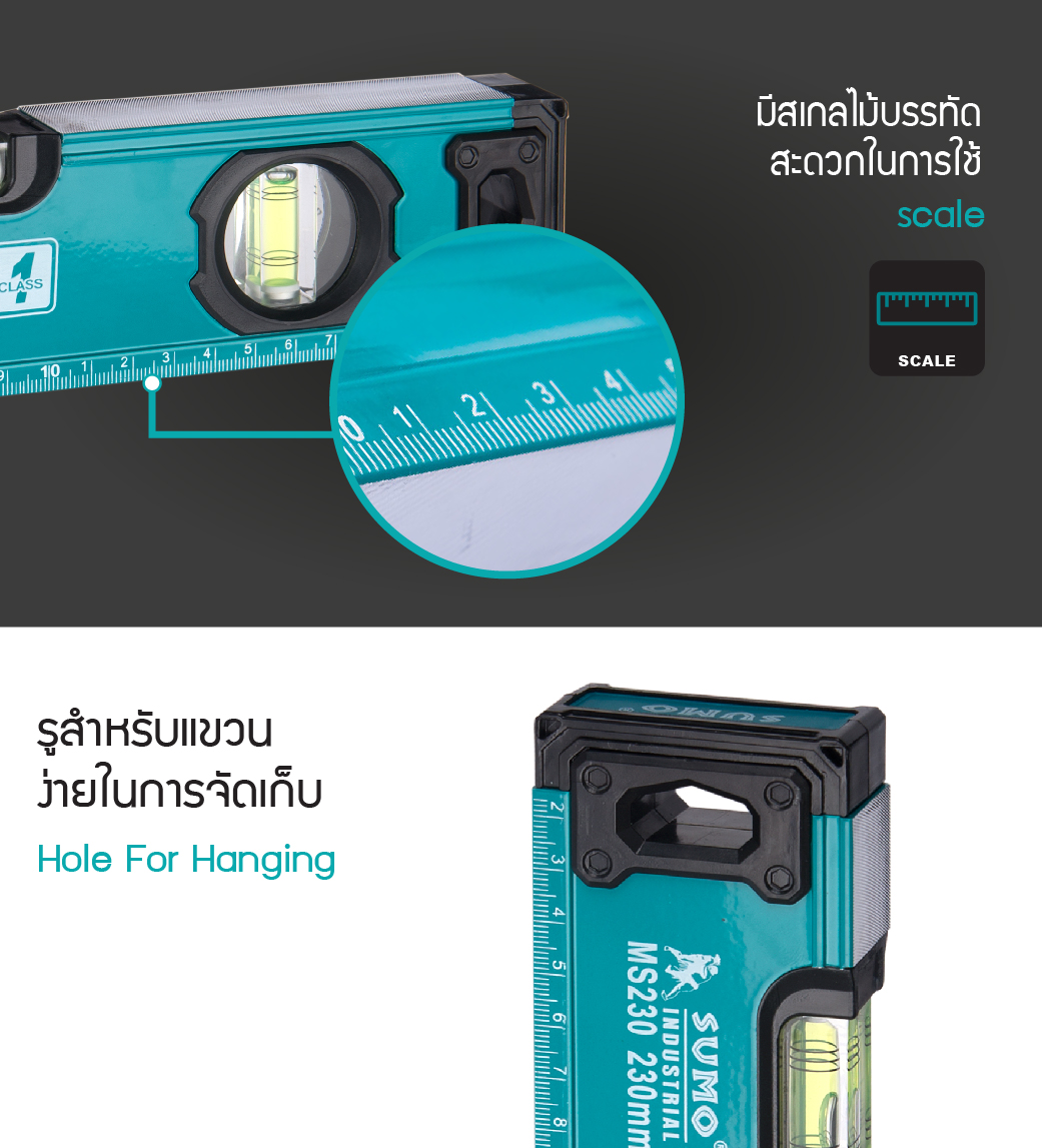 • มีหลอดลูกน้ำ 2 ลูก สำหรับวัดแนวราบ แนวดิ่ง