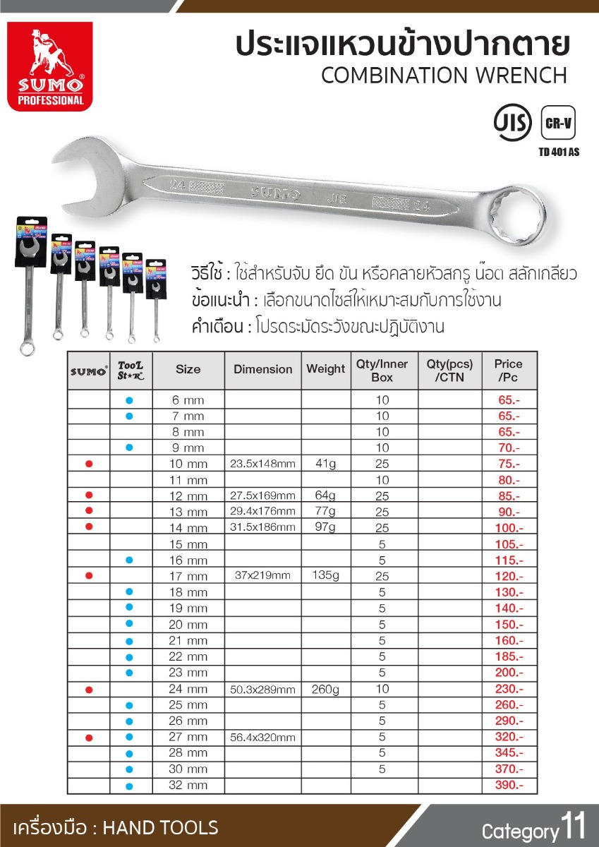 • Combination Wrench 24 mm. SUMO made of high quality steel. Durable, not easily damaged.