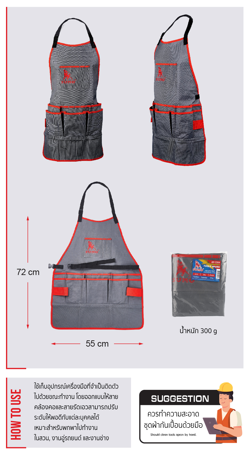 • ชุดผ้ากันเปื้อน ใช้เก็บอุปกรณ์เครื่องมือที่จำเป็นติดตัวไปด้วยขณะทำงาน โดยออกแบบให้สายคล้องคอและสายรัดสามารถปรับระดับให้พอดีกับแต่ละบุคคลได้ เหมาะสำหรับพกพาไปทำงานในสวน, งานอู่รถยนต์ และงานช่าง