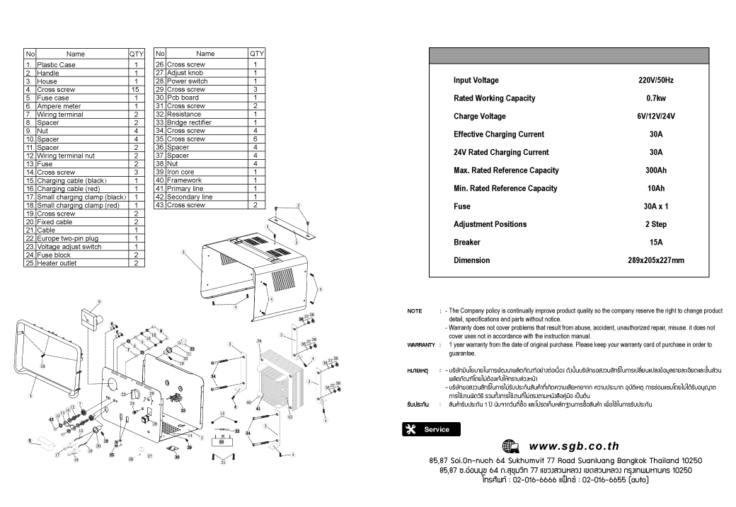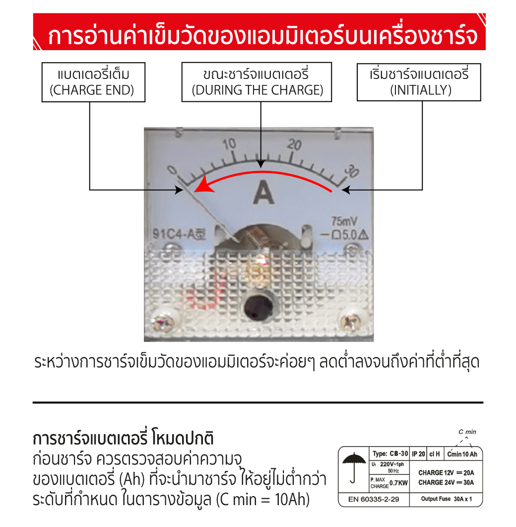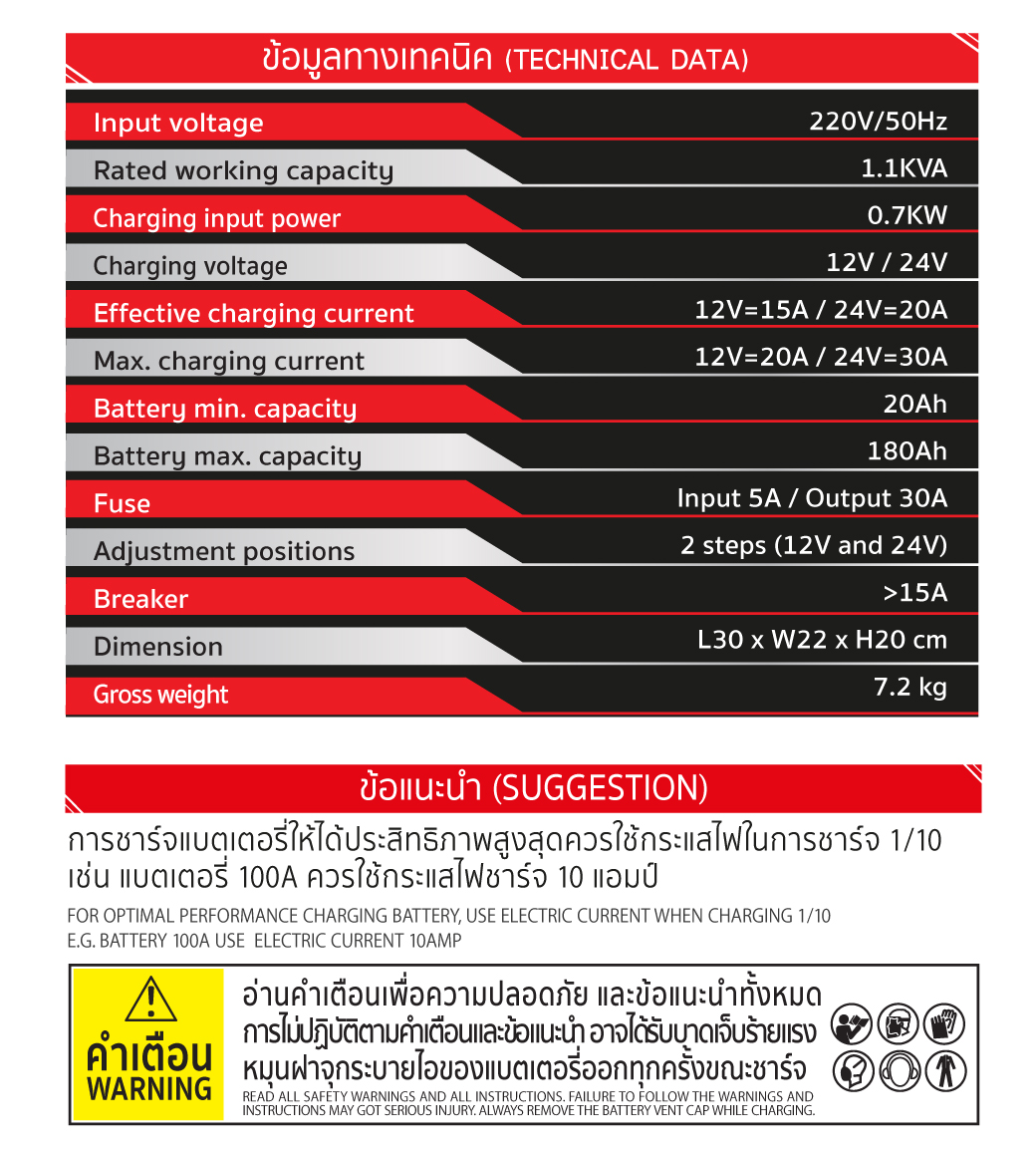 • เครื่องชาร์จแบตเตอรี่ สามารถจ่ายกระแสไฟฟ้าได้สูงสุดถึง 30 แอมป์