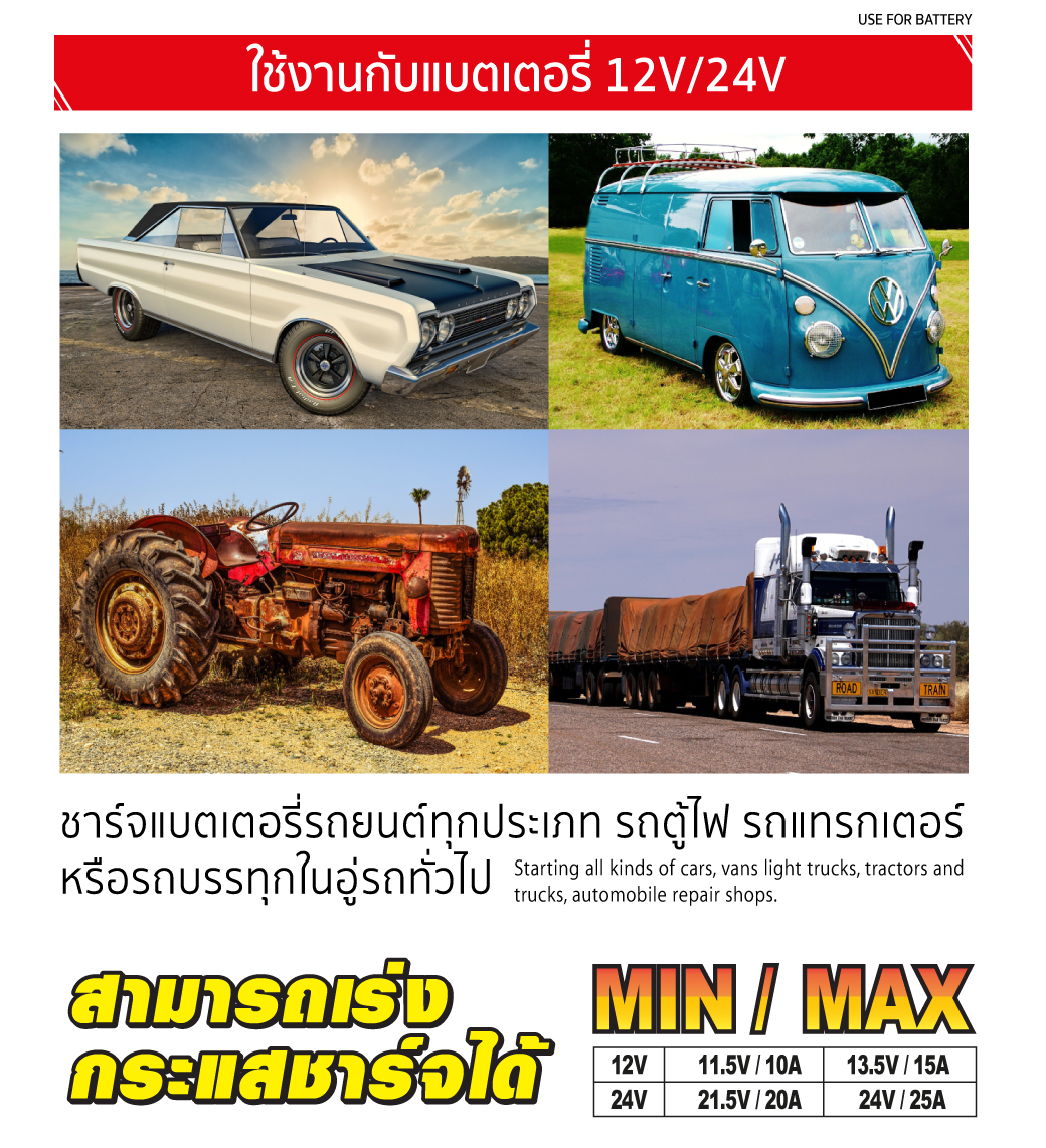 • สำหรับชาร์จแบตรถยนต์ ทุกประเภท รถตู้ไฟ รถแทรกเตอร์หรือรถบรรทุกในอู่รถทั่วไป