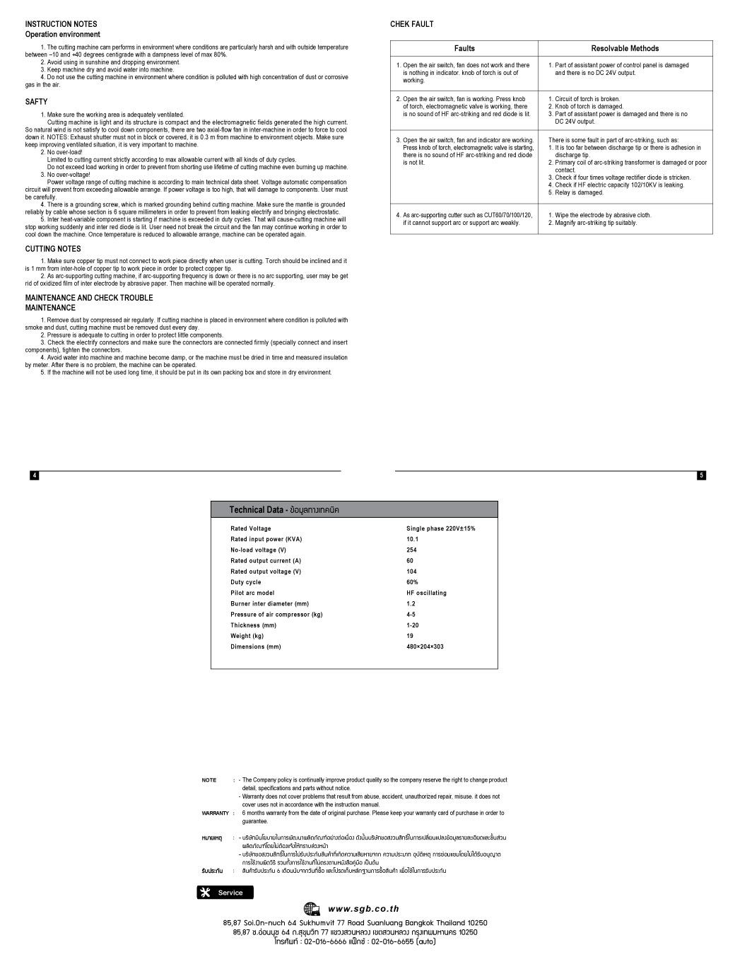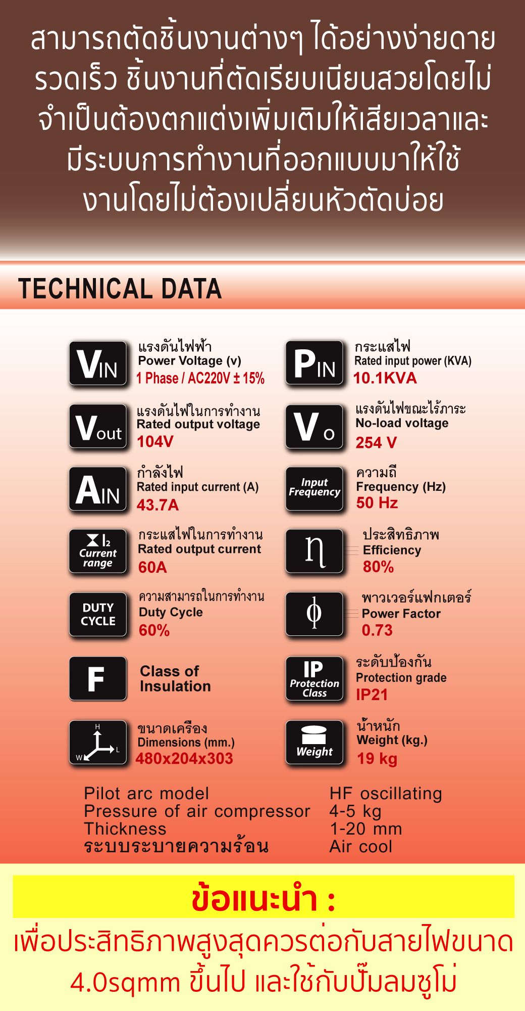 • เพื่อประสิทธิภาพสูงสุดในการตัดควรต่อกับสายไฟขนาด 4.0sqmm ขึ้นไปและใช้กับปั๊มลมซูโม่