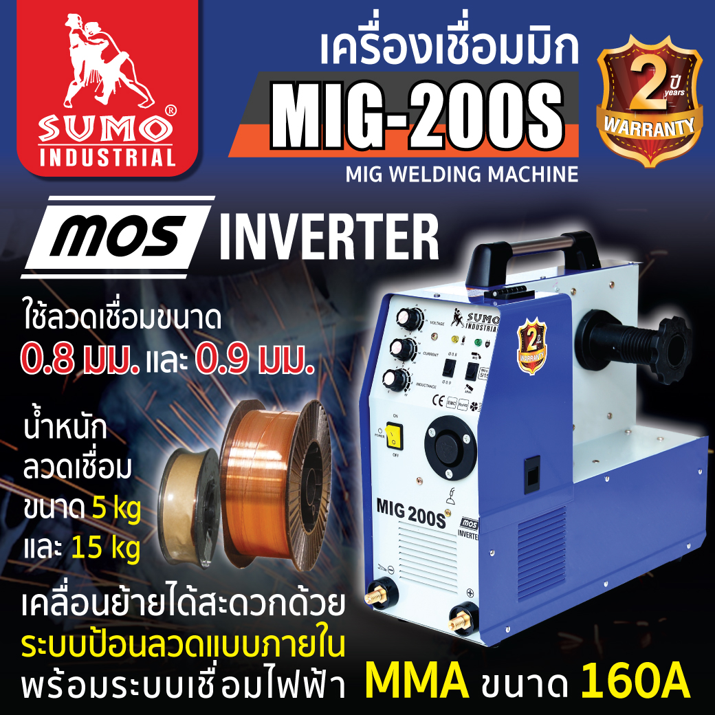 เครื่องเชื่อม MIG CO2 รุ่น 200S SUMO สามารถใช้เชื่อมขนาด 0.8 mm และ 0.9 mm สามารถใช้ลวดขนาด 5 kg และ 15 kg ได้ เคลื่อนย้ายได้สะดวกด้วยระบบป้อนลวดแบบภายใน พร้อมระบบเชื่อมไฟฟ้า MMA ขนาด 200A แอมป์