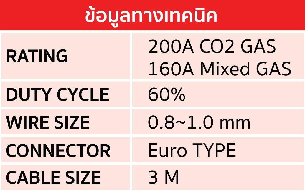 • ระดับ (Rating)  :  200A Co2 , 160A แก๊สผสม (Mixed Gases)