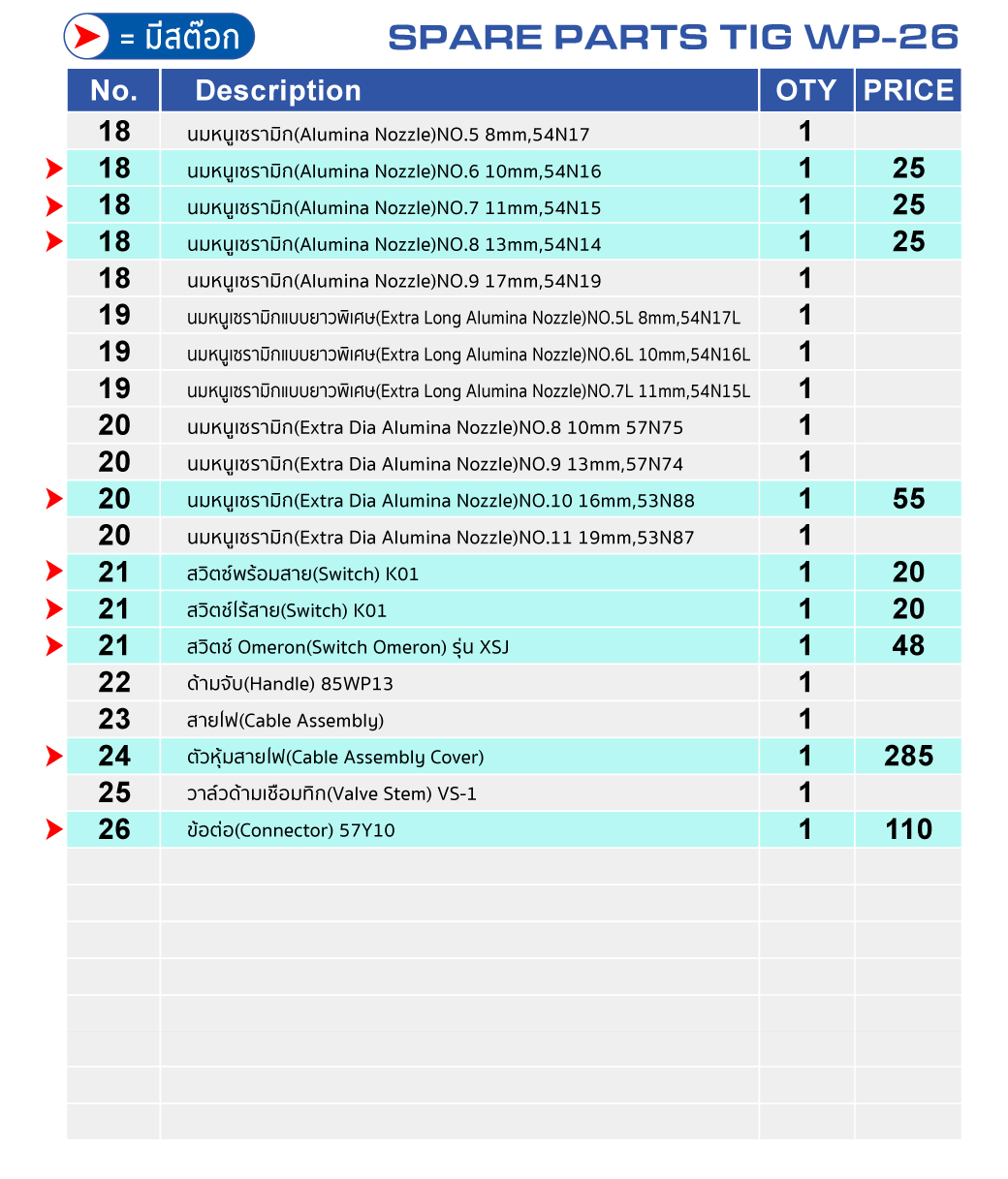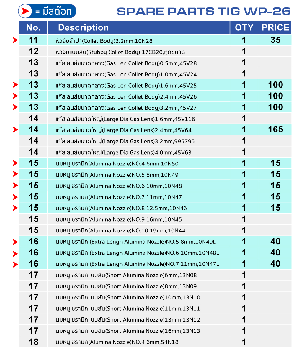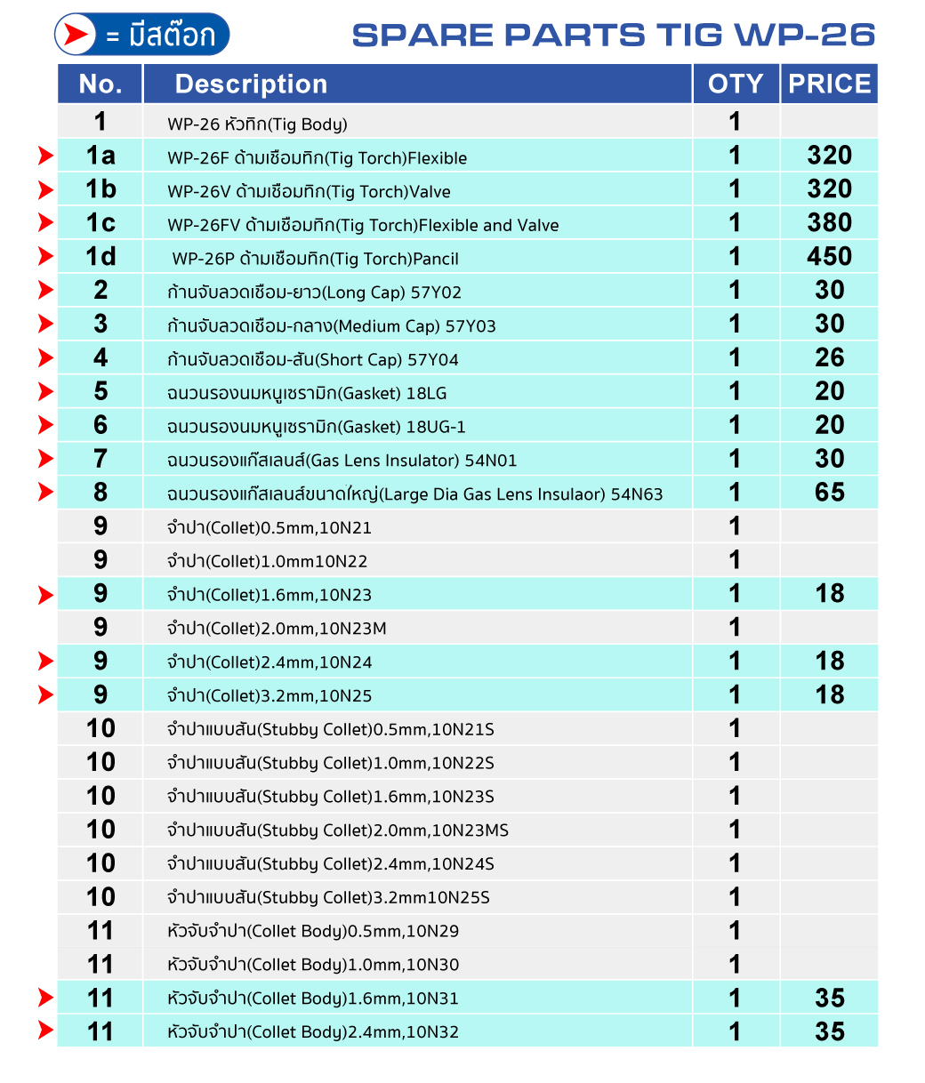• ขนาด Tungsten ที่สามารถใช้ได้ 1.6มม, 2.4มม, 3.2 มม