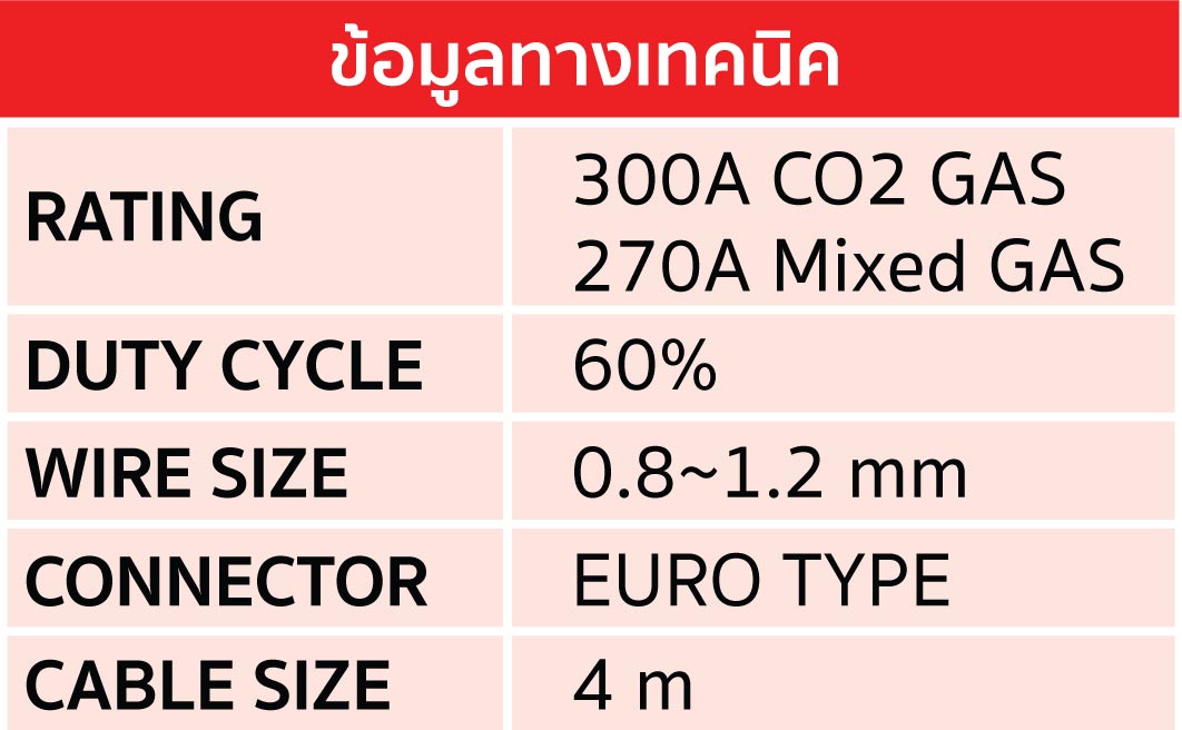 • ระดับ (Rating) : 300A CO2 And 270A แก๊สผสม (Mixed Gases)