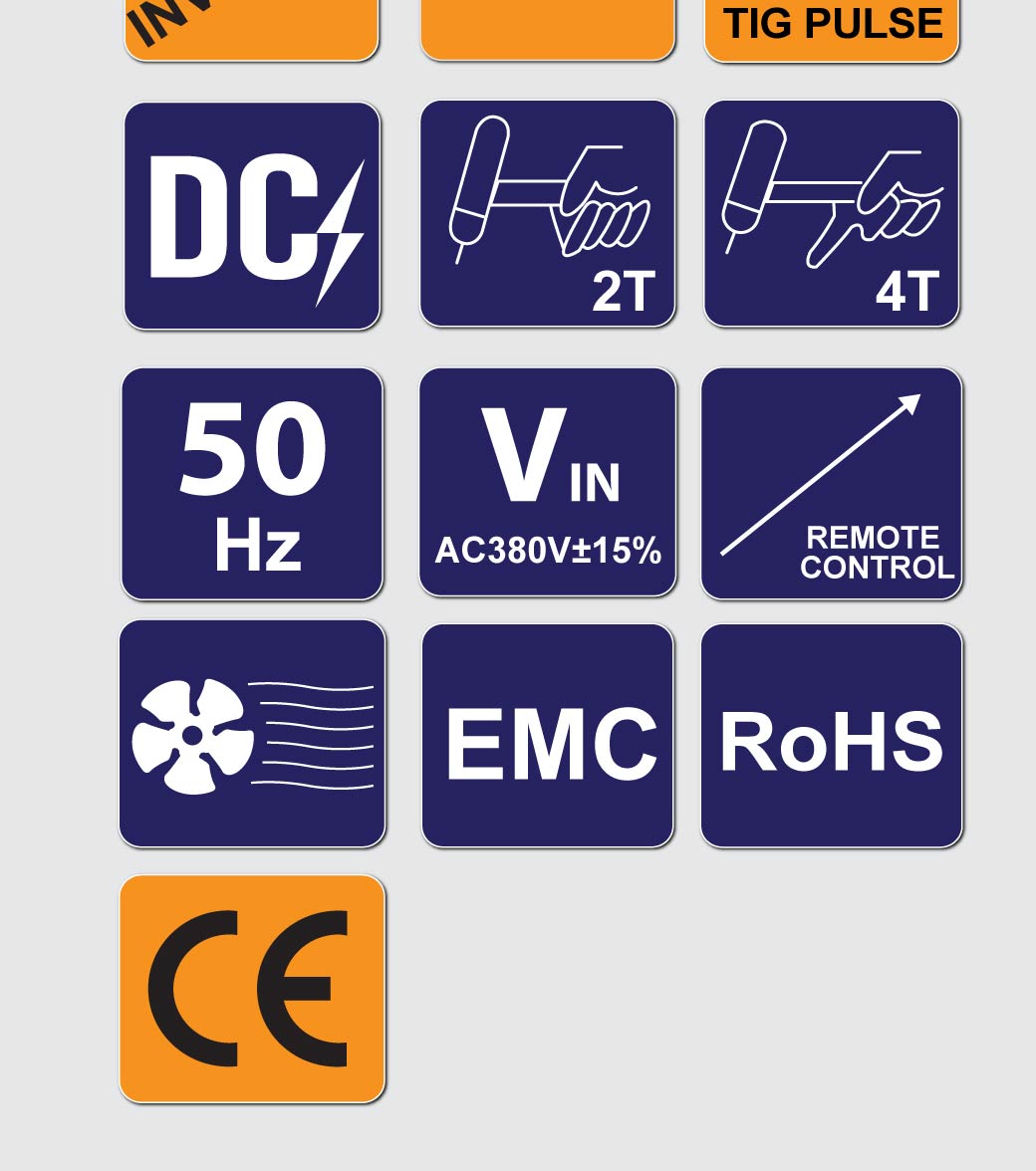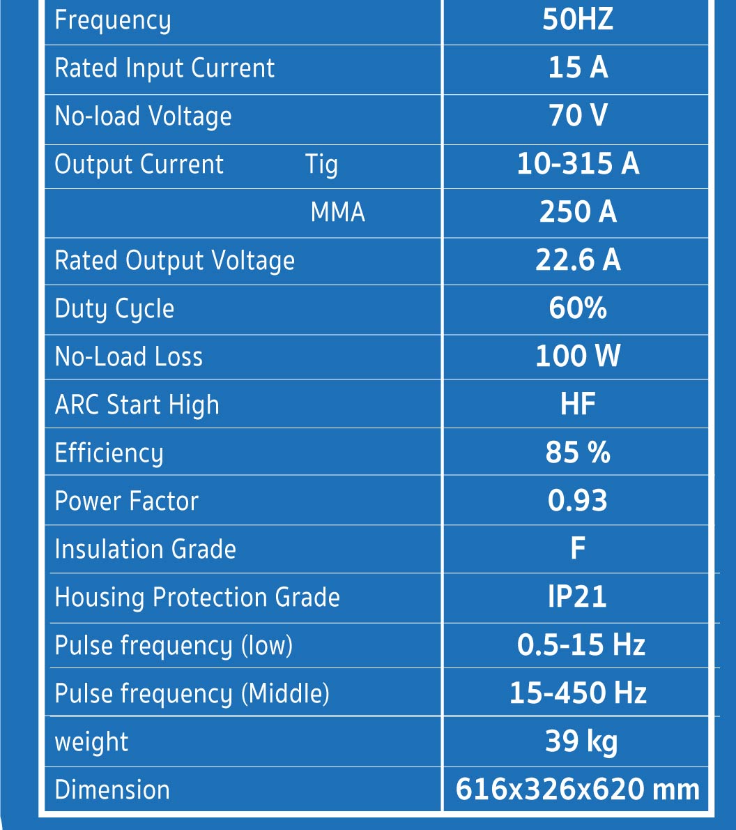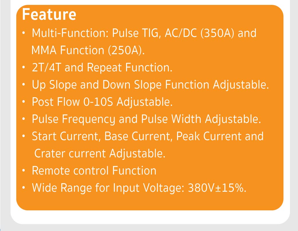 • Multi-Functiono: Pulse TIG, AC/DC (350A) and MMA Function (250A).