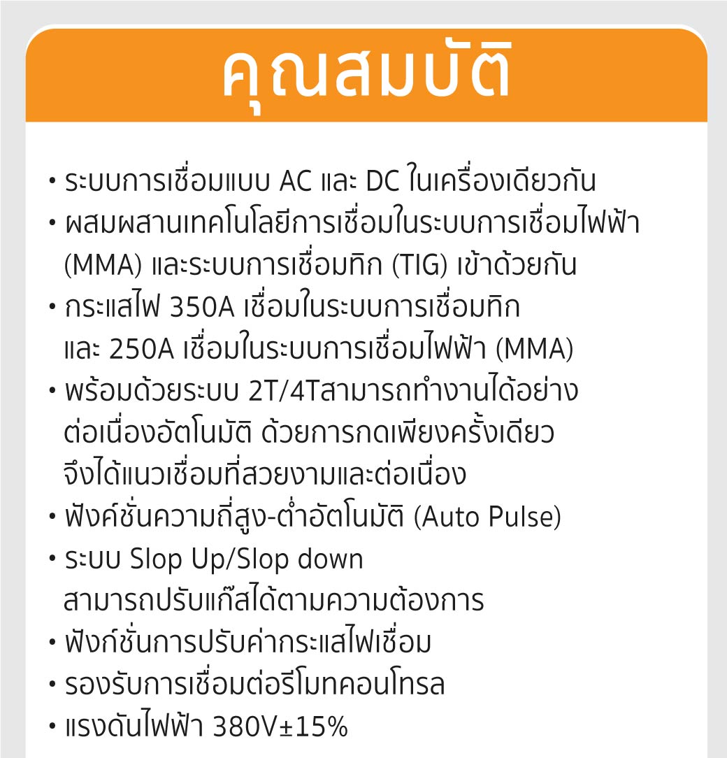 ระบบการเชื่อมแบบ AC และ DC ในเครื่องเดียวกัน ผสมผสานเทคโนโลยีการเชื่อมในระบบการเชื่อมไฟฟ้า(MMA)และระบบการเชื่อมทิก(TIG)เข้าด้วยกัน กระแสไฟ 350A เชื่อมในระบบการเชื่อมทิก และ 250A เชื่อมในระบบการเชื่อมไฟฟ้า(MMA)