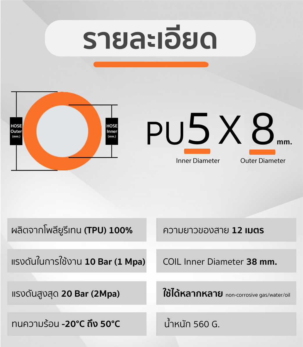 คุณกำลังรีวิว:สายลมสปริง PU ขนาด 5x8 (12 เมตร) สีส้ม