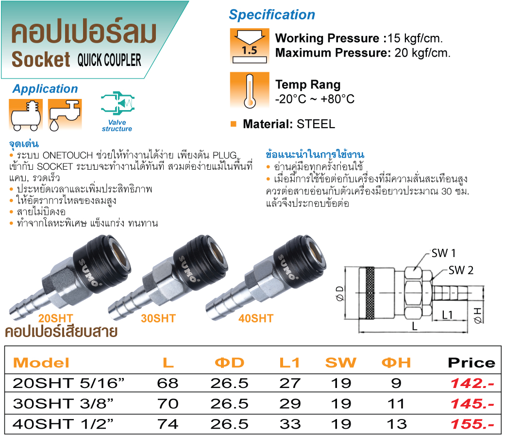 • แรงดันขณะใช้งาน : 15 kgf/cm.