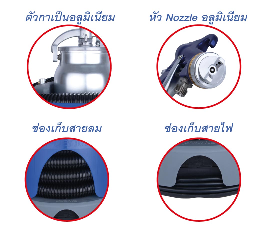 • ตัวเครื่องมีที่เก็บกาพ่น ที่เก็บสายลม และที่เก็บสายไฟ