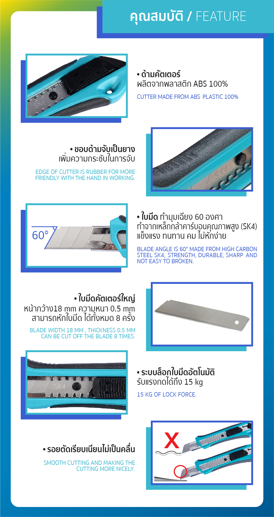 • ระบบล็อกใบมีดอัตโนมัติ รับแรงกดได้ถึง 15 kg