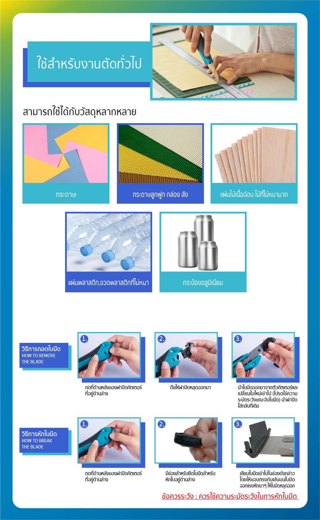 • ใบมีดมีความคม ควรใช้อย่างระมัดระวัง